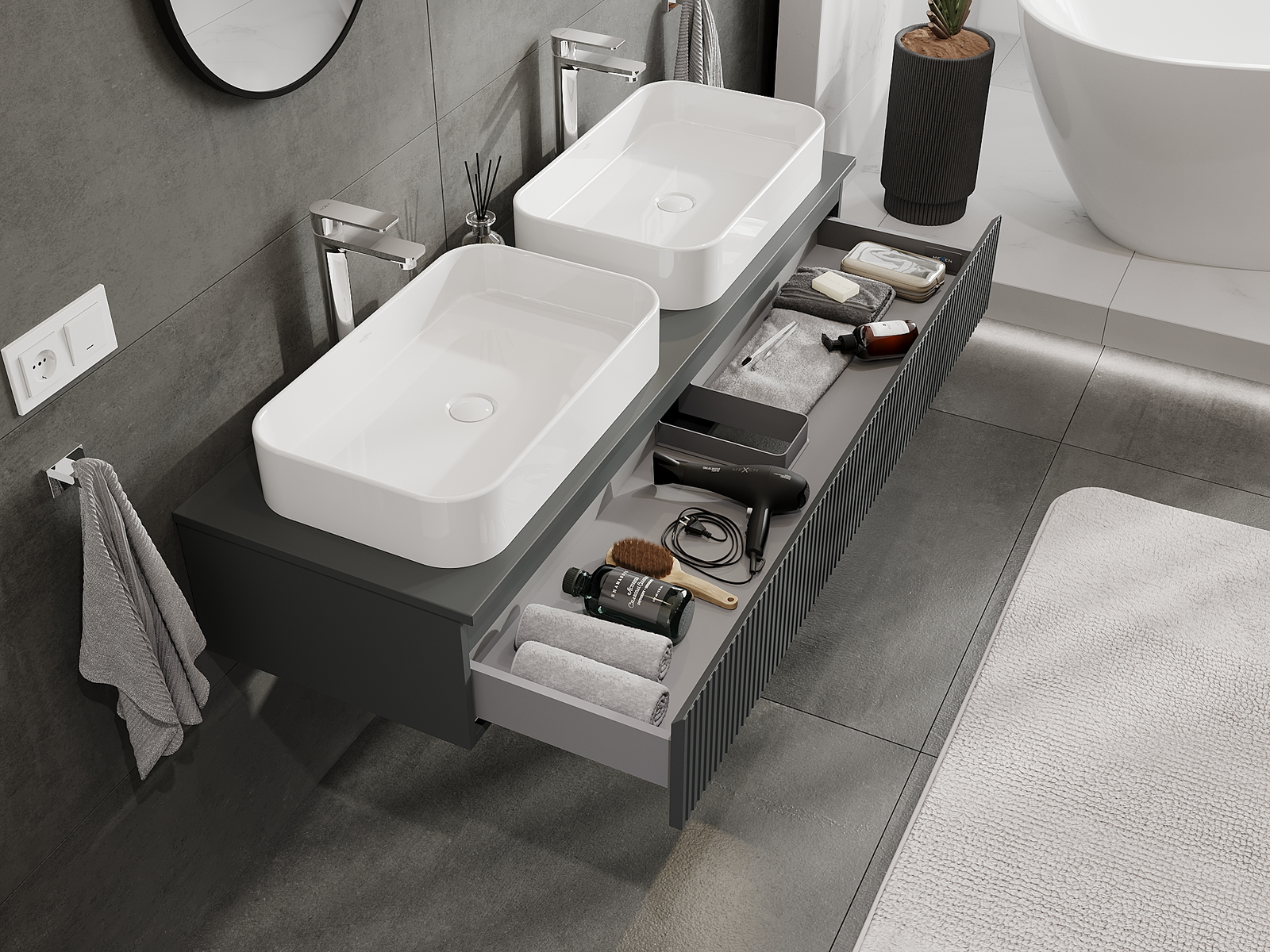 Η εγκοπή στο συρτάρι είναι σχεδιασμένη με τέτοιο τρόπο, ώστε να φιλοξενεί το σιφόνι, το οποίο είναι απαραίτητο στις εγκαταστάσεις νιπτήρων. Έτσι, το έπιπλο μπορεί να εγκατασταθεί πλήρως λειτουργικά, χωρίς την ανάγκη παραίτησης από χώρο στο συρτάρι υπέρ της εγκατάστασης.