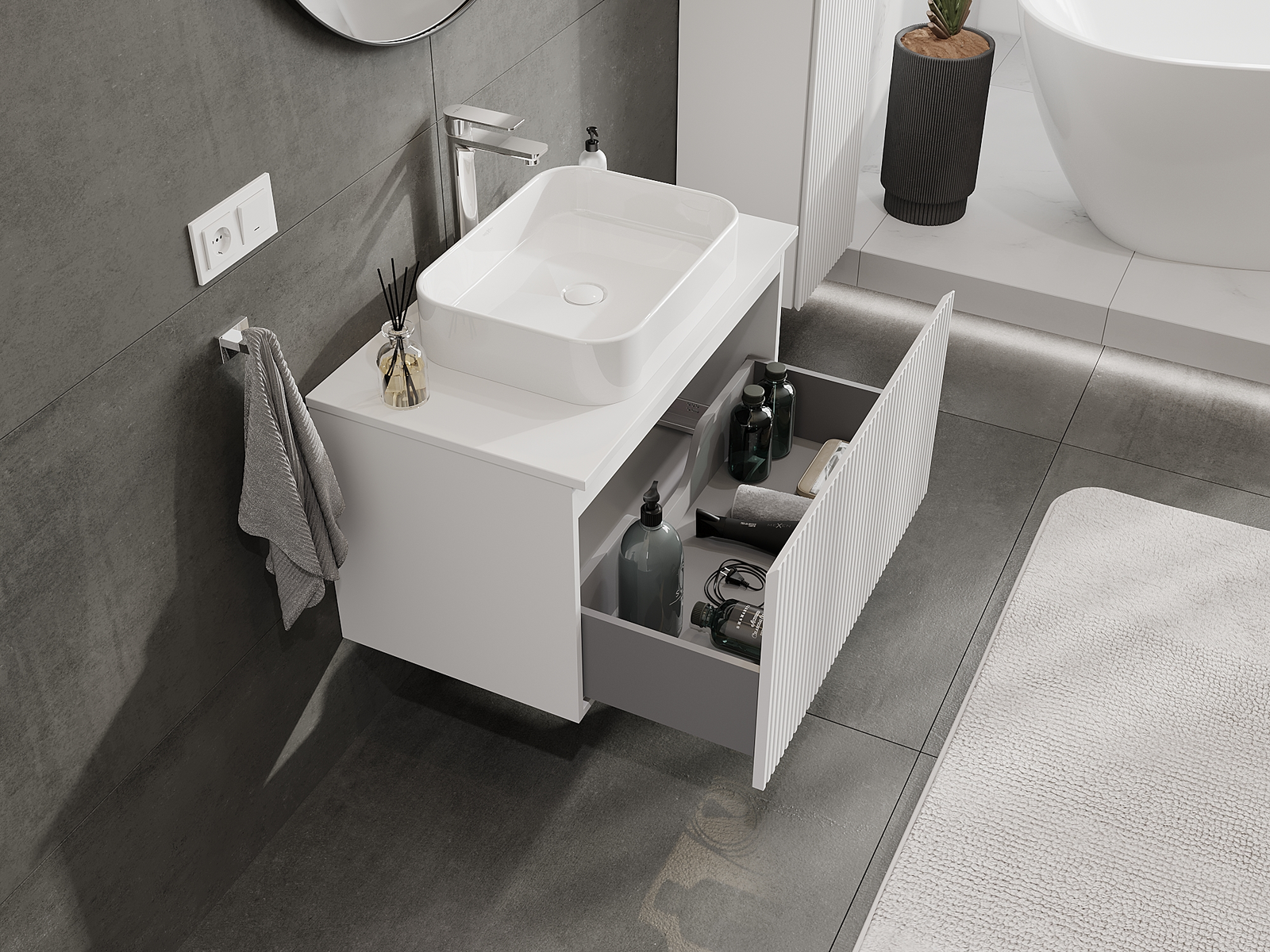 Η εγκοπή στο συρτάρι είναι σχεδιασμένη με τέτοιο τρόπο, ώστε να φιλοξενεί το σιφόνι, το οποίο είναι απαραίτητο στις εγκαταστάσεις νιπτήρων. Έτσι, το έπιπλο μπορεί να εγκατασταθεί πλήρως λειτουργικά, χωρίς την ανάγκη παραίτησης από χώρο στο συρτάρι υπέρ της εγκατάστασης.
