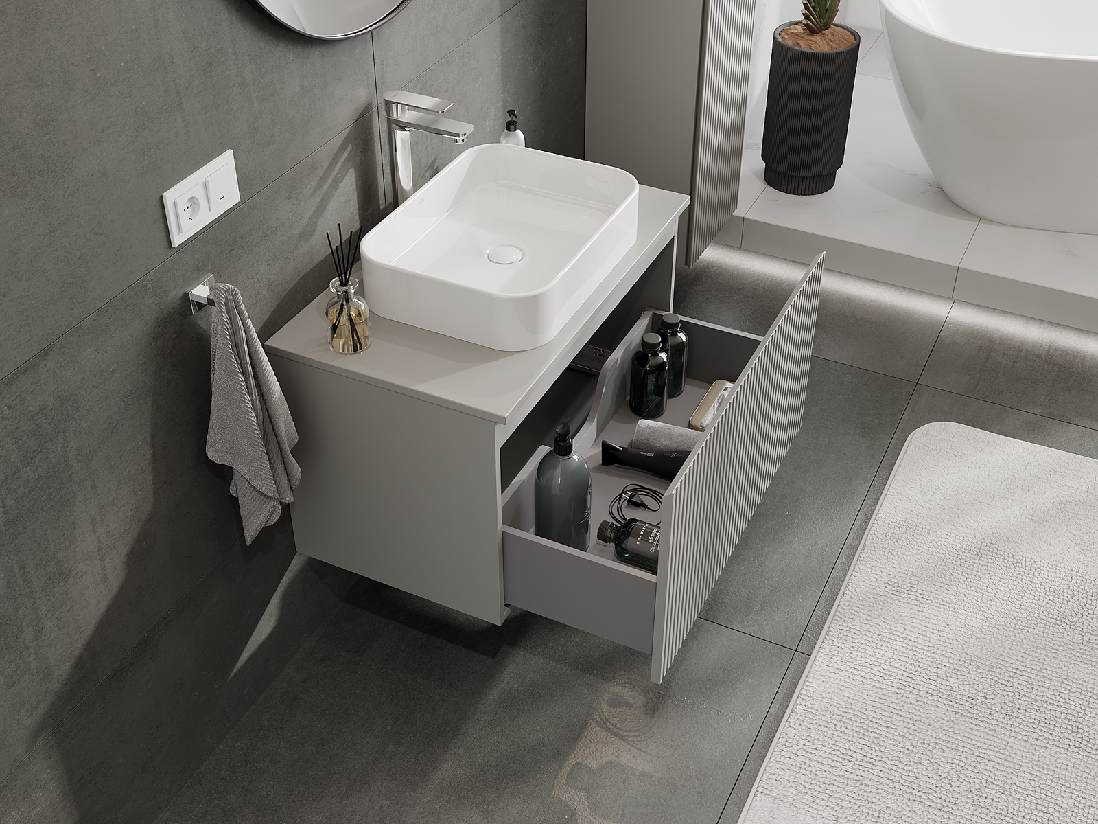Η εγκοπή στο συρτάρι είναι σχεδιασμένη με τέτοιο τρόπο, ώστε να φιλοξενεί το σιφόνι, το οποίο είναι απαραίτητο στις εγκαταστάσεις νιπτήρων. Έτσι, το έπιπλο μπορεί να εγκατασταθεί πλήρως λειτουργικά, χωρίς την ανάγκη παραίτησης από χώρο στο συρτάρι υπέρ της εγκατάστασης.