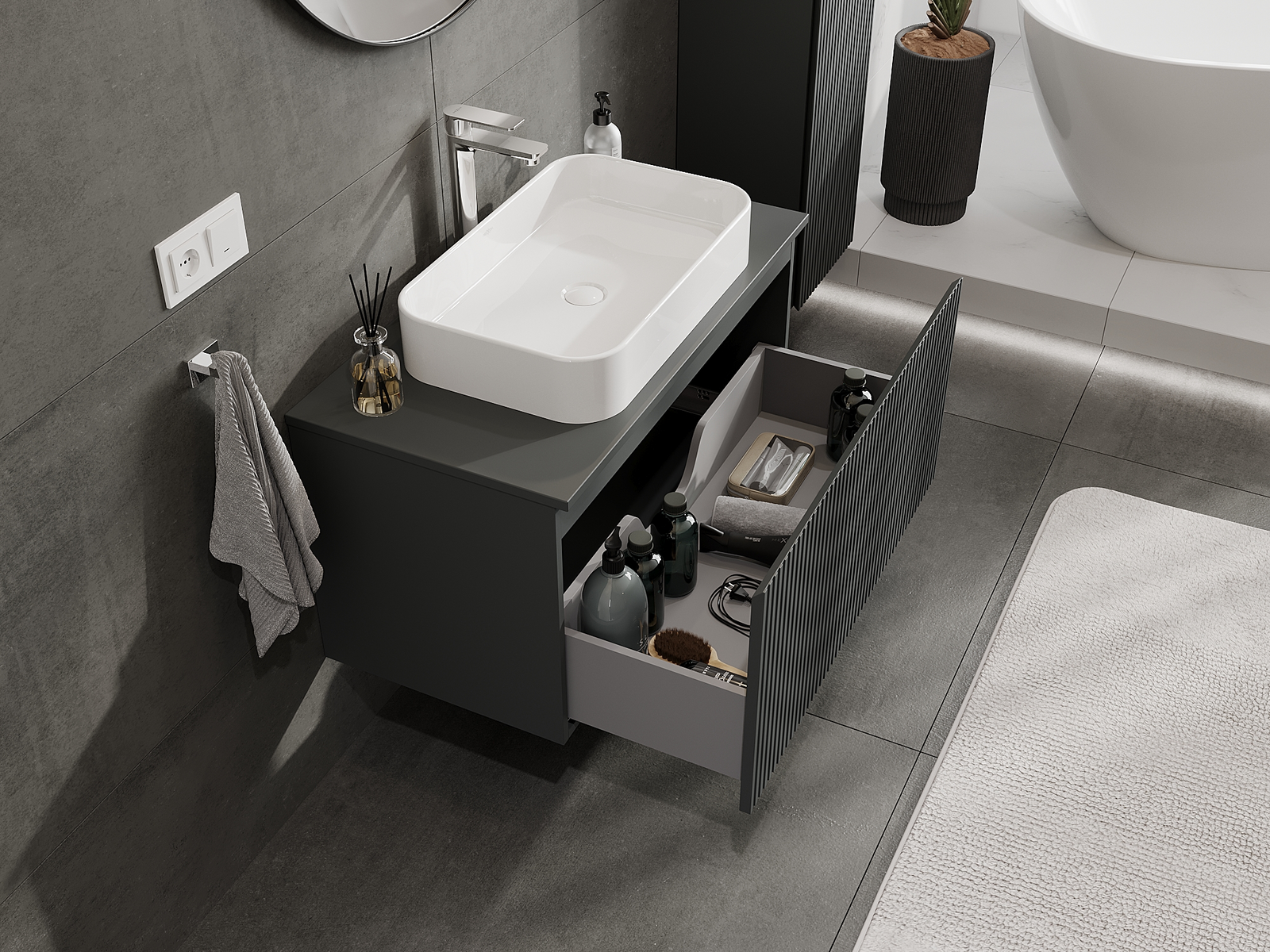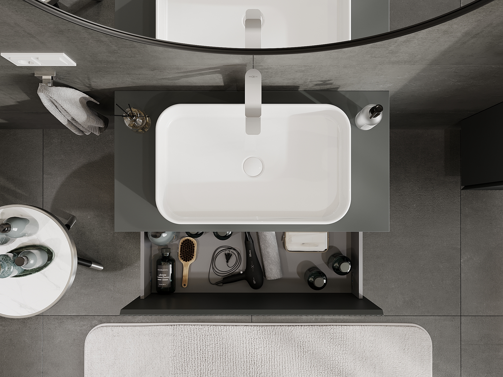 Η εγκοπή στο συρτάρι είναι σχεδιασμένη με τέτοιο τρόπο, ώστε να φιλοξενεί το σιφόνι, το οποίο είναι απαραίτητο στις εγκαταστάσεις νιπτήρων. Έτσι, το έπιπλο μπορεί να εγκατασταθεί πλήρως λειτουργικά, χωρίς την ανάγκη παραίτησης από χώρο στο συρτάρι υπέρ της εγκατάστασης.