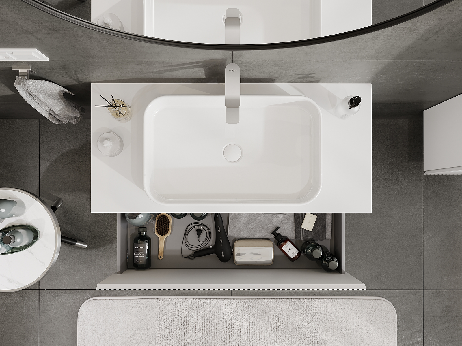 Η εγκοπή στο συρτάρι είναι σχεδιασμένη με τέτοιο τρόπο, ώστε να φιλοξενεί το σιφόνι, το οποίο είναι απαραίτητο στις εγκαταστάσεις νιπτήρων. Έτσι, το έπιπλο μπορεί να εγκατασταθεί πλήρως λειτουργικά, χωρίς την ανάγκη παραίτησης από χώρο στο συρτάρι υπέρ της εγκατάστασης.