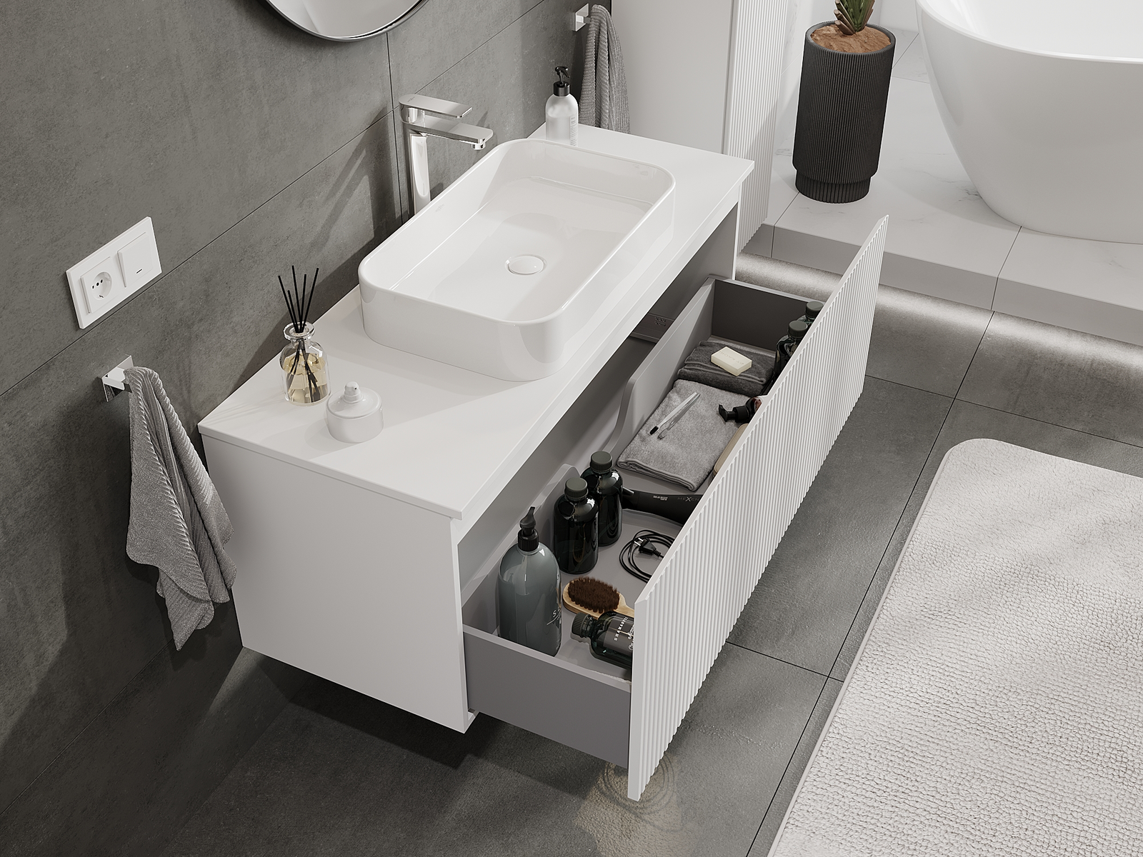 Η εγκοπή στο συρτάρι είναι σχεδιασμένη με τέτοιο τρόπο, ώστε να φιλοξενεί το σιφόνι, το οποίο είναι απαραίτητο στις εγκαταστάσεις νιπτήρων. Έτσι, το έπιπλο μπορεί να εγκατασταθεί πλήρως λειτουργικά, χωρίς την ανάγκη παραίτησης από χώρο στο συρτάρι υπέρ της εγκατάστασης.