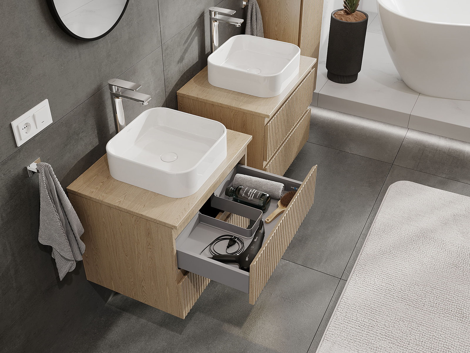 Η εγκοπή στο συρτάρι είναι σχεδιασμένη με τέτοιο τρόπο, ώστε να φιλοξενεί το σιφόνι, το οποίο είναι απαραίτητο στις εγκαταστάσεις νιπτήρων. Έτσι, το έπιπλο μπορεί να εγκατασταθεί πλήρως λειτουργικά, χωρίς την ανάγκη παραίτησης από χώρο στο συρτάρι υπέρ της εγκατάστασης.