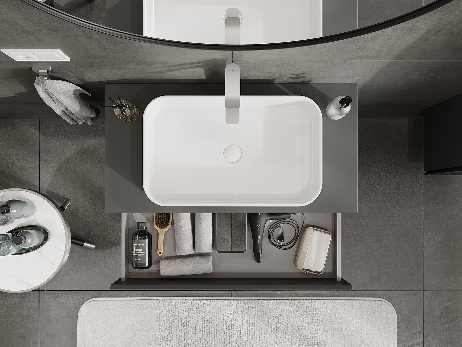 Η εγκοπή στο συρτάρι είναι σχεδιασμένη με τέτοιο τρόπο, ώστε να φιλοξενεί το σιφόνι, το οποίο είναι απαραίτητο στις εγκαταστάσεις νιπτήρων. Έτσι, το έπιπλο μπορεί να εγκατασταθεί πλήρως λειτουργικά, χωρίς την ανάγκη παραίτησης από χώρο στο συρτάρι υπέρ της εγκατάστασης.