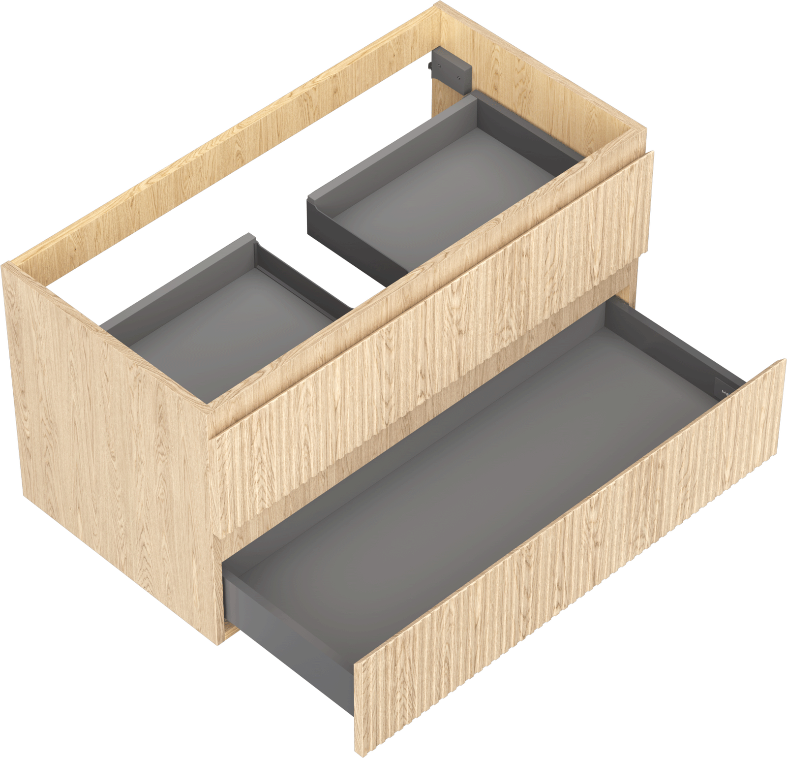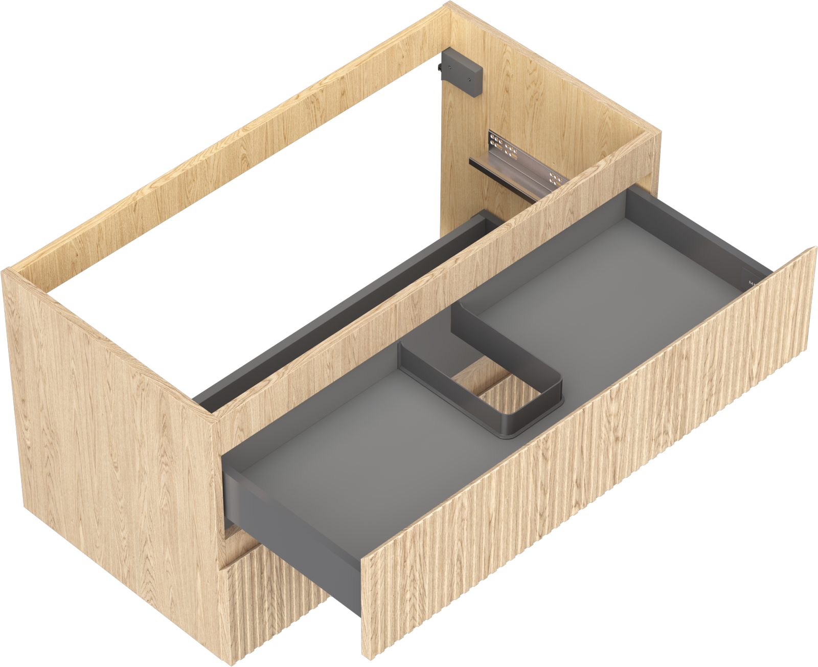 Η εγκοπή στο συρτάρι είναι σχεδιασμένη με τέτοιο τρόπο, ώστε να φιλοξενεί το σιφόνι, το οποίο είναι απαραίτητο στις εγκαταστάσεις νιπτήρων. Έτσι, το έπιπλο μπορεί να εγκατασταθεί πλήρως λειτουργικά, χωρίς την ανάγκη παραίτησης από χώρο στο συρτάρι υπέρ της εγκατάστασης.