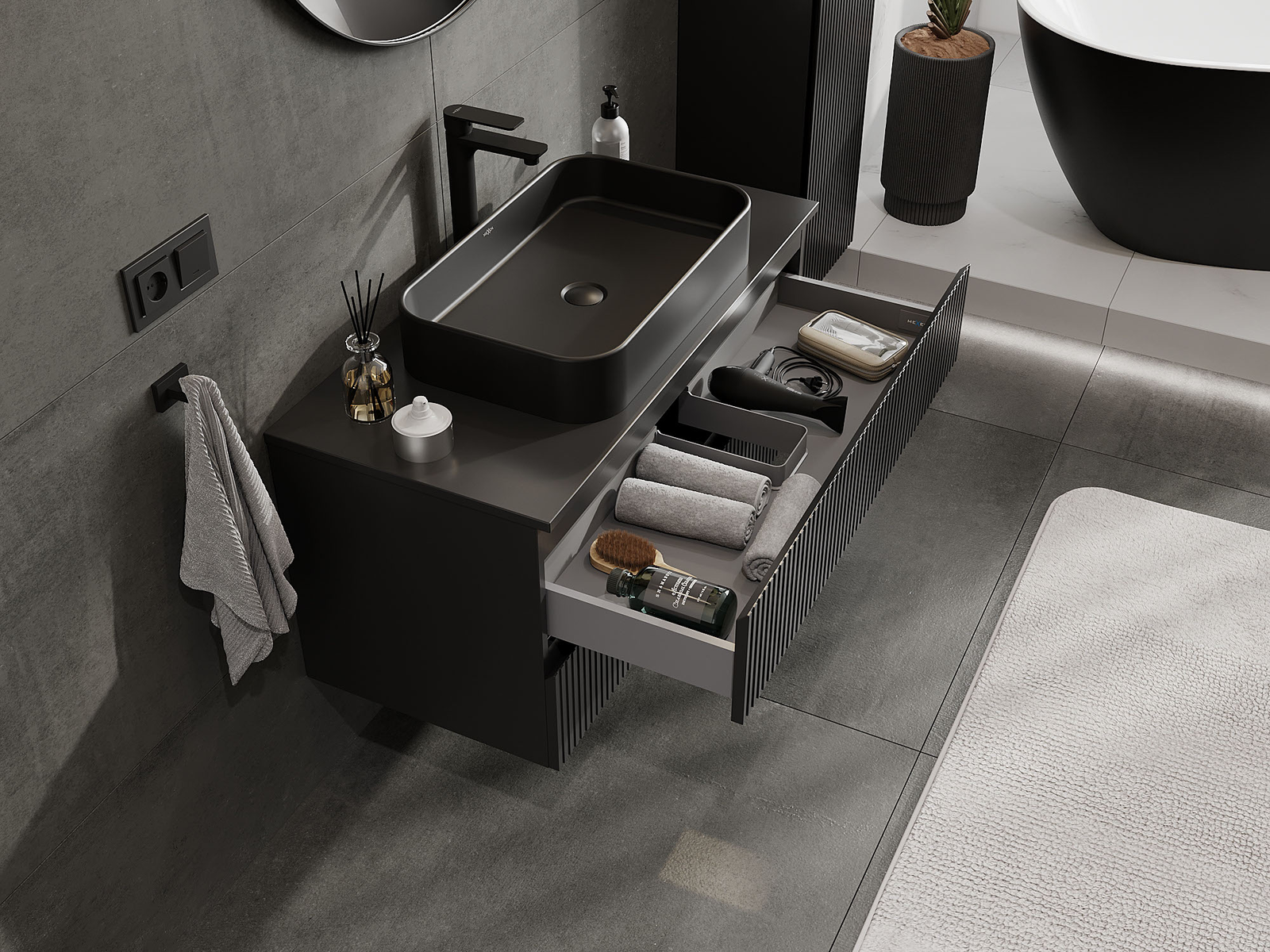 Η εγκοπή στο συρτάρι είναι σχεδιασμένη με τέτοιο τρόπο, ώστε να φιλοξενεί το σιφόνι, το οποίο είναι απαραίτητο στις εγκαταστάσεις νιπτήρων. Έτσι, το έπιπλο μπορεί να εγκατασταθεί πλήρως λειτουργικά, χωρίς την ανάγκη παραίτησης από χώρο στο συρτάρι υπέρ της εγκατάστασης.