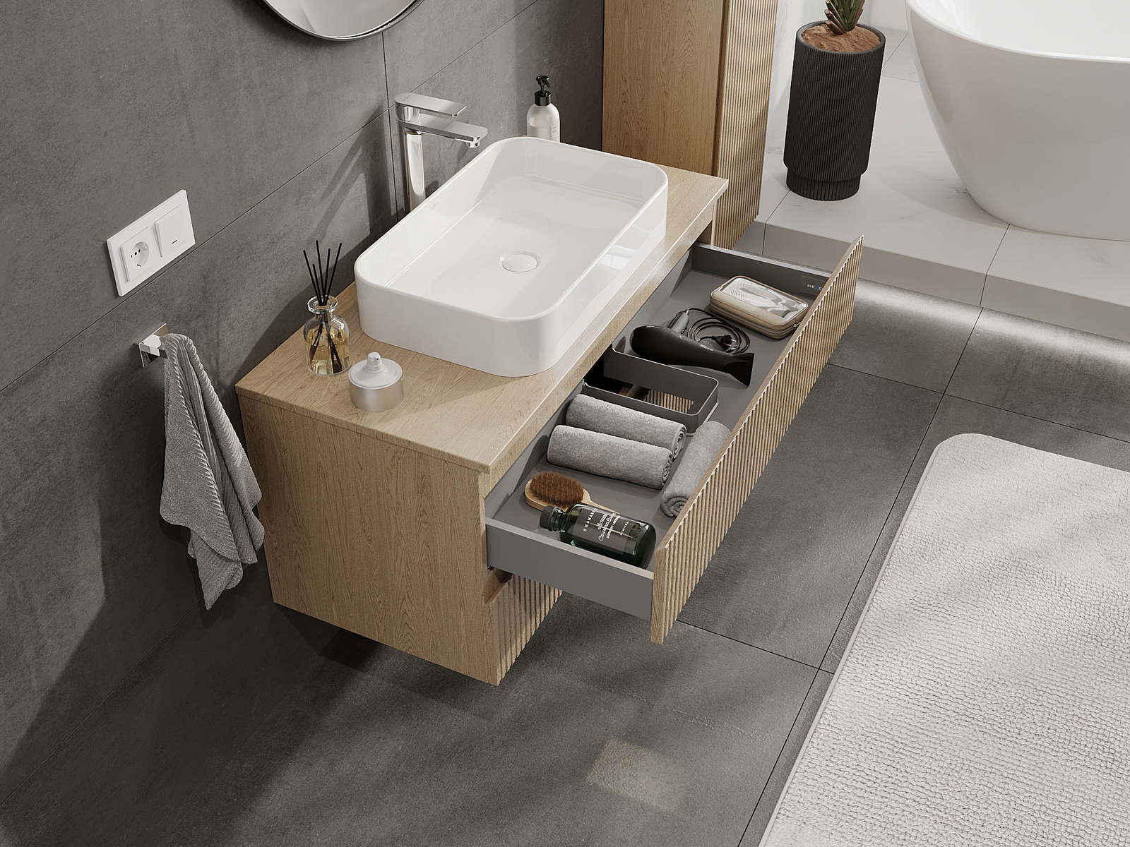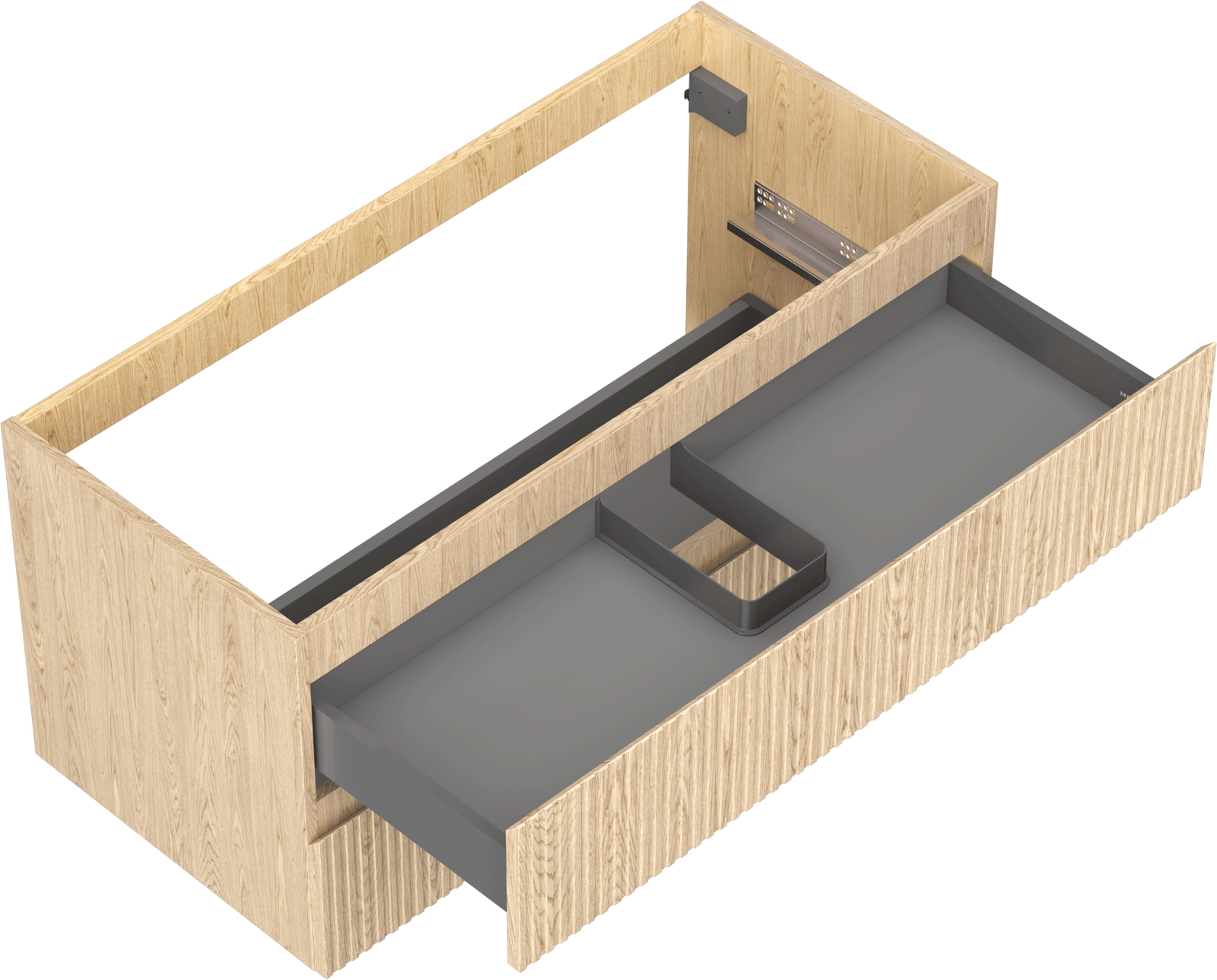 Η εγκοπή στο συρτάρι είναι σχεδιασμένη με τέτοιο τρόπο, ώστε να φιλοξενεί το σιφόνι, το οποίο είναι απαραίτητο στις εγκαταστάσεις νιπτήρων. Έτσι, το έπιπλο μπορεί να εγκατασταθεί πλήρως λειτουργικά, χωρίς την ανάγκη παραίτησης από χώρο στο συρτάρι υπέρ της εγκατάστασης.