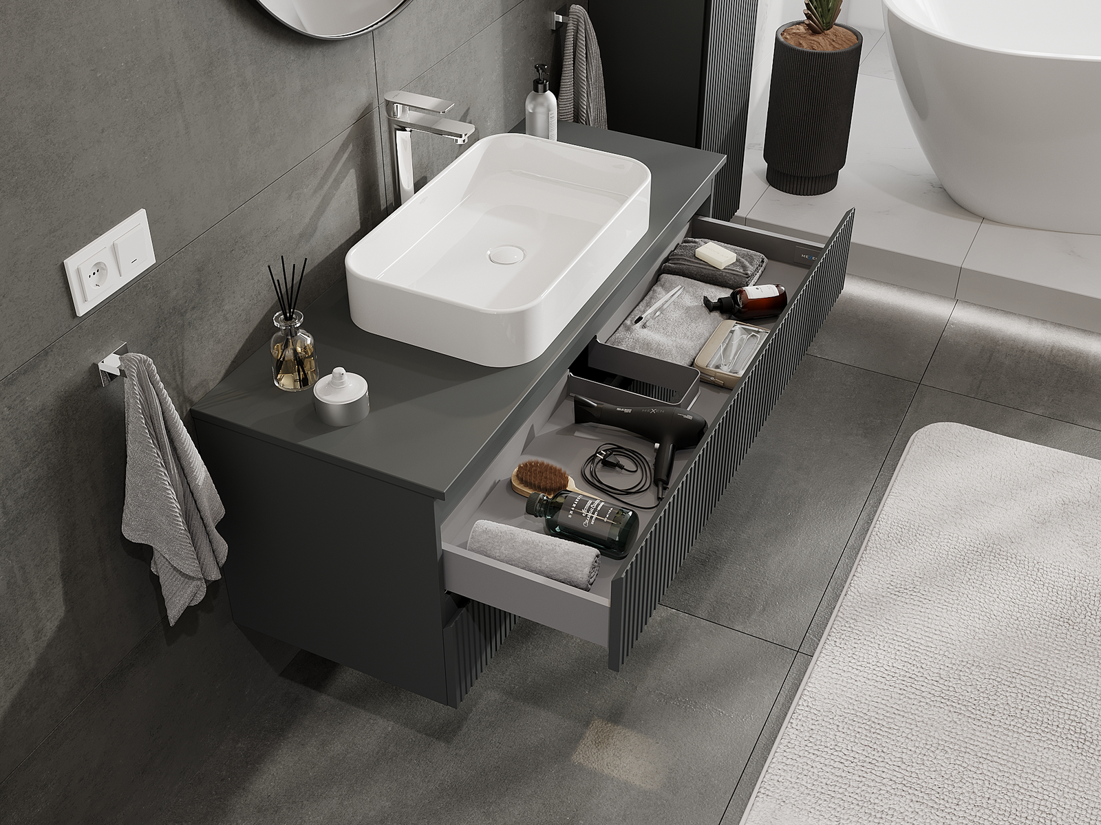 Η εγκοπή στο συρτάρι είναι σχεδιασμένη με τέτοιο τρόπο, ώστε να φιλοξενεί το σιφόνι, το οποίο είναι απαραίτητο στις εγκαταστάσεις νιπτήρων. Έτσι, το έπιπλο μπορεί να εγκατασταθεί πλήρως λειτουργικά, χωρίς την ανάγκη παραίτησης από χώρο στο συρτάρι υπέρ της εγκατάστασης.