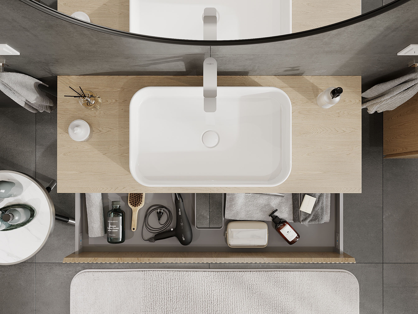 Η εγκοπή στο συρτάρι είναι σχεδιασμένη με τέτοιο τρόπο, ώστε να φιλοξενεί το σιφόνι, το οποίο είναι απαραίτητο στις εγκαταστάσεις νιπτήρων. Έτσι, το έπιπλο μπορεί να εγκατασταθεί πλήρως λειτουργικά, χωρίς την ανάγκη παραίτησης από χώρο στο συρτάρι υπέρ της εγκατάστασης.