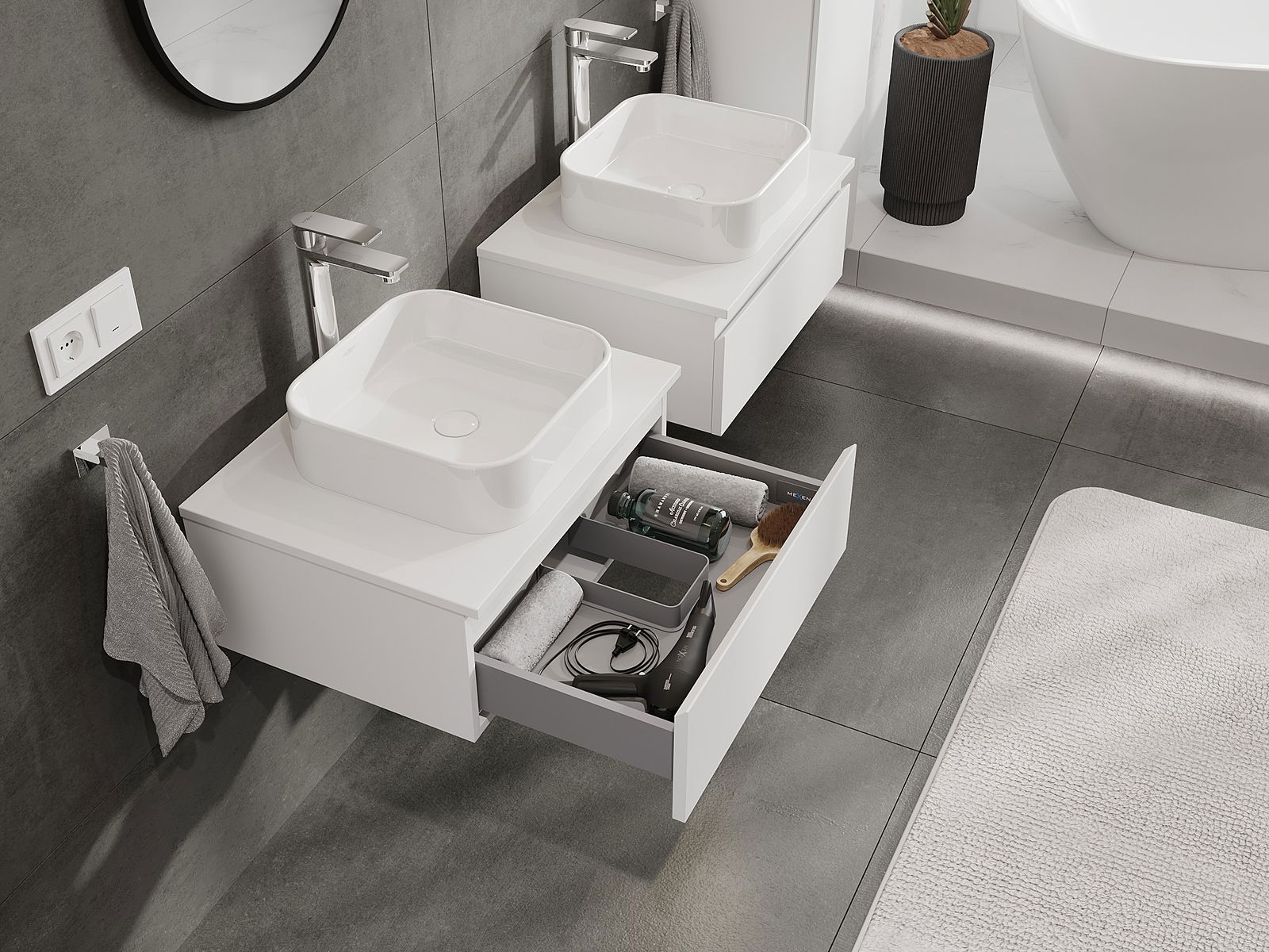 Τα αρθρωτά έπιπλα μπάνιου μας μπορούν να συνδυαστούν μεταξύ τους σε διάφορες χρωματικές διαμορφώσεις, επιτρέποντας πλήρη εξατομίκευση. Μπορείτε να επιλέξετε τόσο την εμφάνιση όσο και τις λειτουργίες των επιμέρους στοιχείων, ώστε να προσαρμόσετε τα έπιπλα στις δικές σας στιλιστικές και λειτουργικές προτιμήσεις.