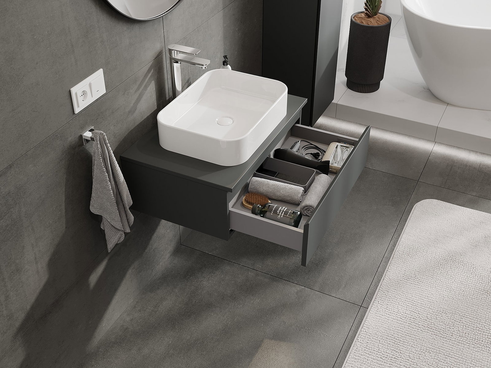 Η εγκοπή στο συρτάρι είναι σχεδιασμένη με τέτοιο τρόπο, ώστε να φιλοξενεί το σιφόνι, το οποίο είναι απαραίτητο στις εγκαταστάσεις νιπτήρων. Έτσι, το έπιπλο μπορεί να εγκατασταθεί πλήρως λειτουργικά, χωρίς την ανάγκη παραίτησης από χώρο στο συρτάρι υπέρ της εγκατάστασης.
