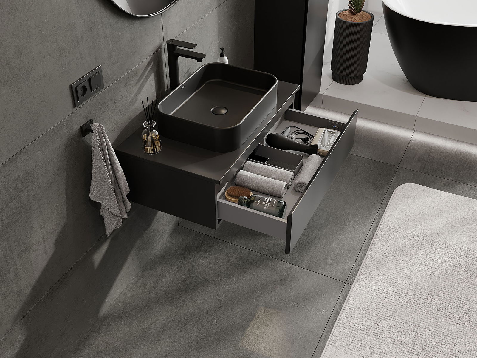 Η εγκοπή στο συρτάρι είναι σχεδιασμένη με τέτοιο τρόπο, ώστε να φιλοξενεί το σιφόνι, το οποίο είναι απαραίτητο στις εγκαταστάσεις νιπτήρων. Έτσι, το έπιπλο μπορεί να εγκατασταθεί πλήρως λειτουργικά, χωρίς την ανάγκη παραίτησης από χώρο στο συρτάρι υπέρ της εγκατάστασης.