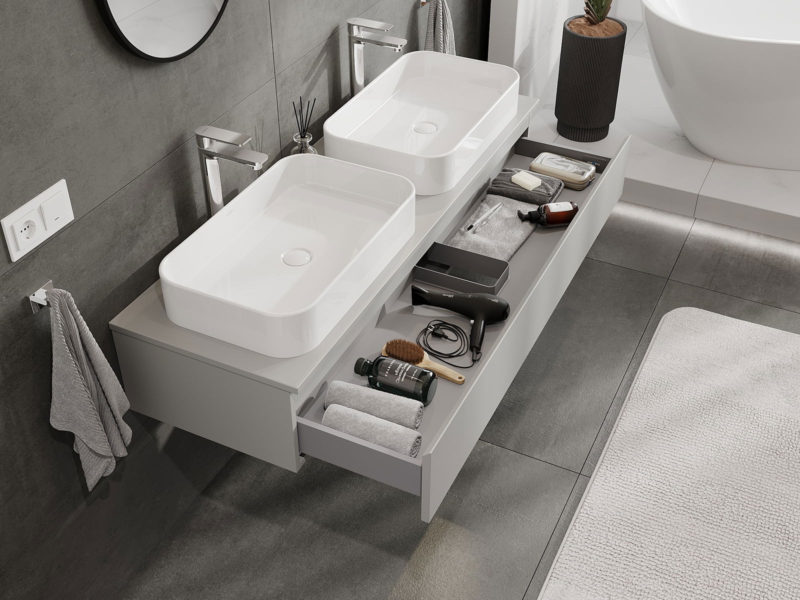 Τα αρθρωτά έπιπλα μπάνιου μας μπορούν να συνδυαστούν μεταξύ τους σε διάφορες χρωματικές διαμορφώσεις, επιτρέποντας πλήρη εξατομίκευση. Μπορείτε να επιλέξετε τόσο την εμφάνιση όσο και τις λειτουργίες των επιμέρους στοιχείων, ώστε να προσαρμόσετε τα έπιπλα στις δικές σας στιλιστικές και λειτουργικές προτιμήσεις.