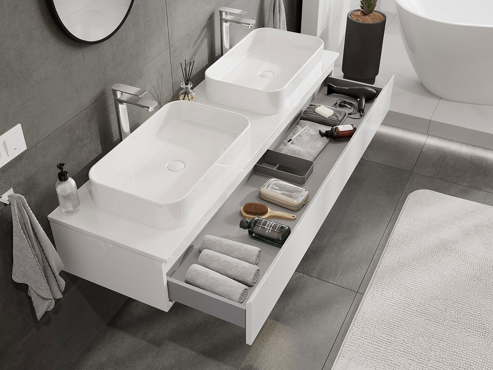 Η εγκοπή στο συρτάρι είναι σχεδιασμένη με τέτοιο τρόπο, ώστε να φιλοξενεί το σιφόνι, το οποίο είναι απαραίτητο στις εγκαταστάσεις νιπτήρων. Έτσι, το έπιπλο μπορεί να εγκατασταθεί πλήρως λειτουργικά, χωρίς την ανάγκη παραίτησης από χώρο στο συρτάρι υπέρ της εγκατάστασης.