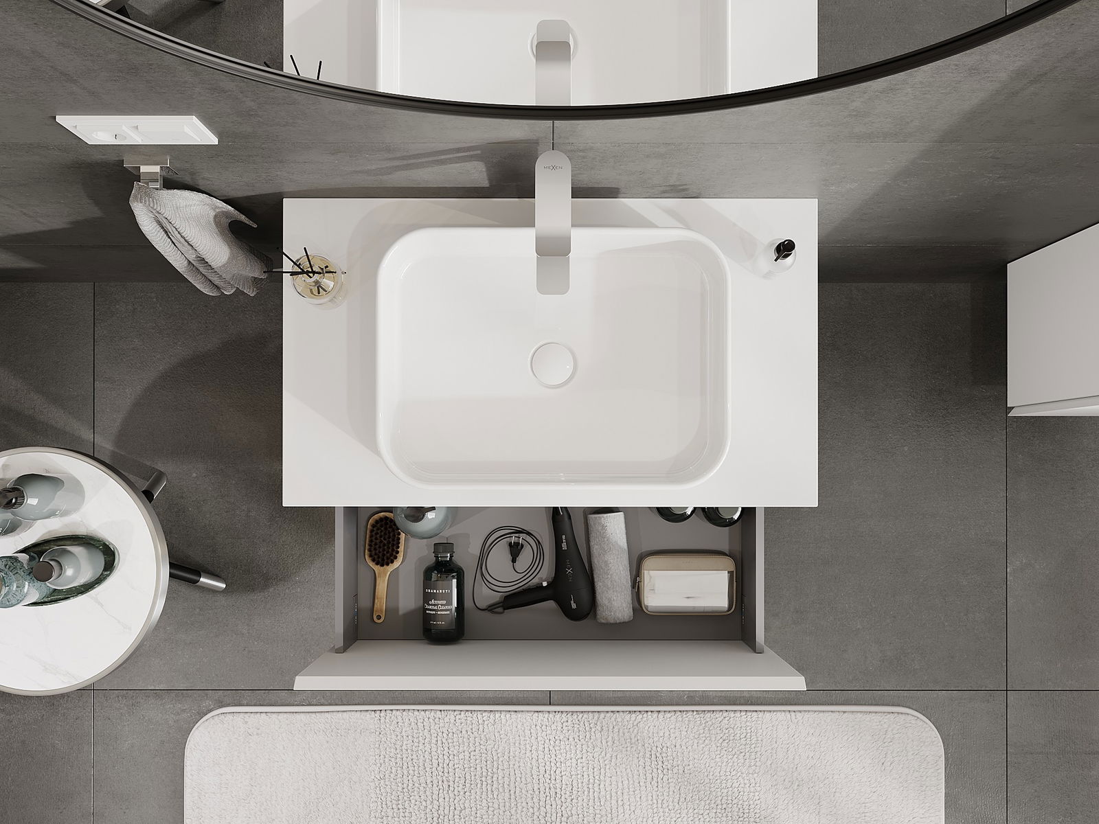Η εγκοπή στο συρτάρι είναι σχεδιασμένη με τέτοιο τρόπο, ώστε να φιλοξενεί το σιφόνι, το οποίο είναι απαραίτητο στις εγκαταστάσεις νιπτήρων. Έτσι, το έπιπλο μπορεί να εγκατασταθεί πλήρως λειτουργικά, χωρίς την ανάγκη παραίτησης από χώρο στο συρτάρι υπέρ της εγκατάστασης.