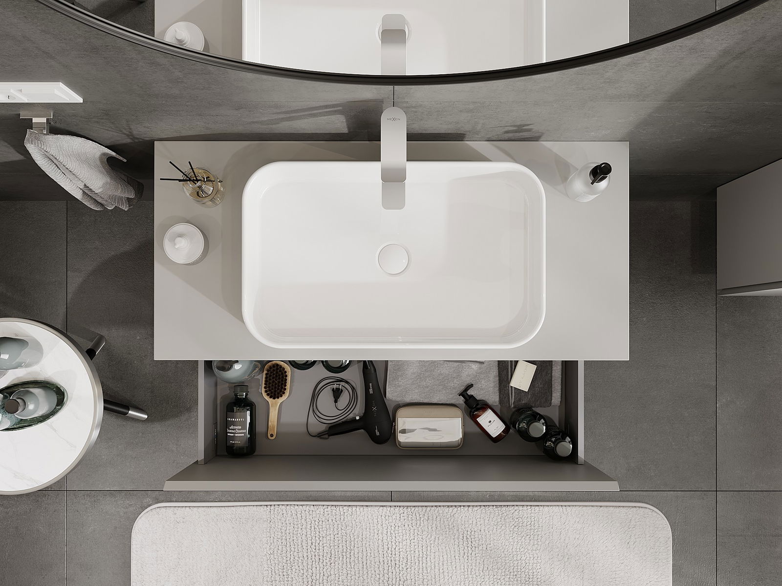 Η εγκοπή στο συρτάρι είναι σχεδιασμένη με τέτοιο τρόπο, ώστε να φιλοξενεί το σιφόνι, το οποίο είναι απαραίτητο στις εγκαταστάσεις νιπτήρων. Έτσι, το έπιπλο μπορεί να εγκατασταθεί πλήρως λειτουργικά, χωρίς την ανάγκη παραίτησης από χώρο στο συρτάρι υπέρ της εγκατάστασης.