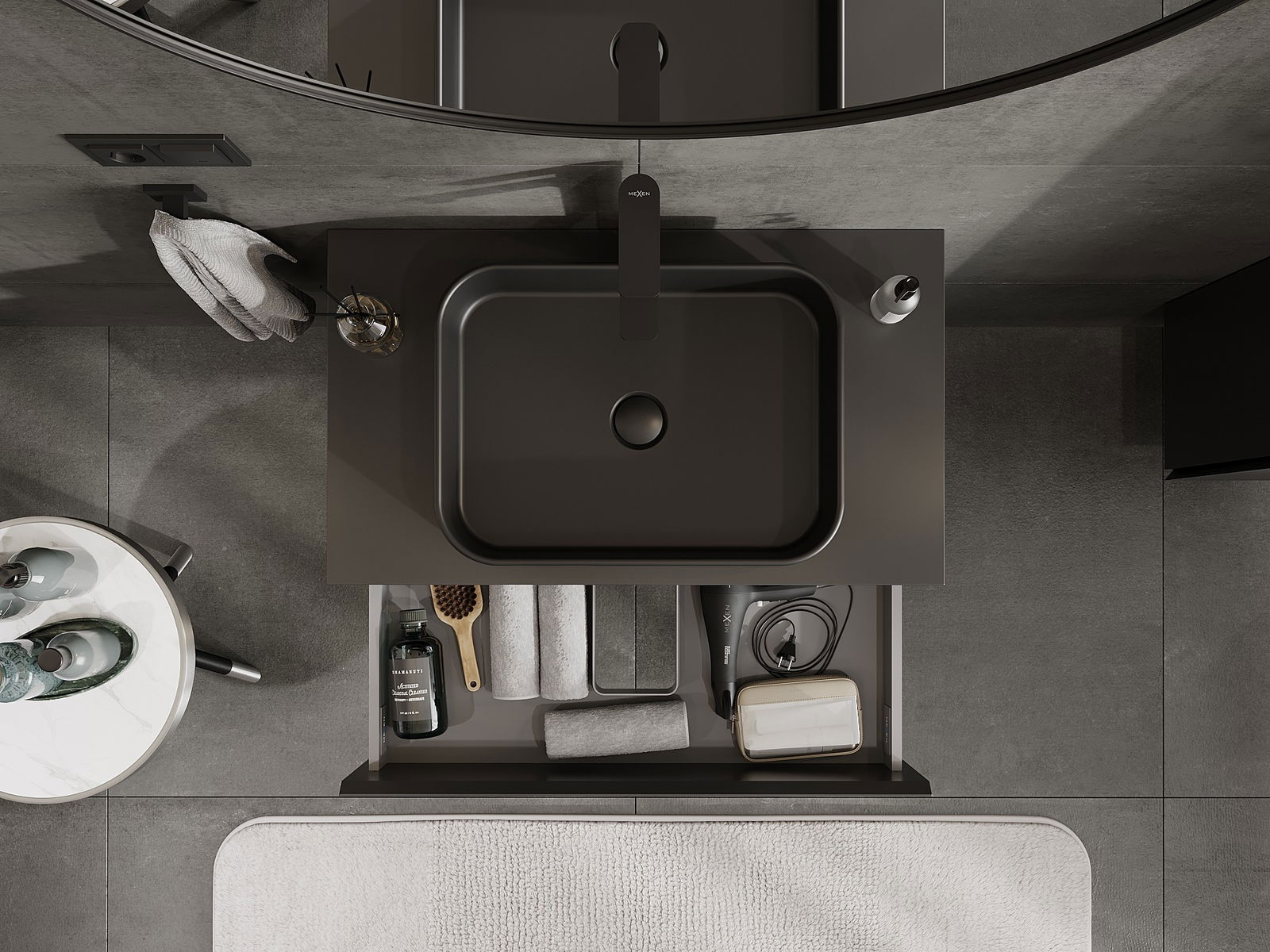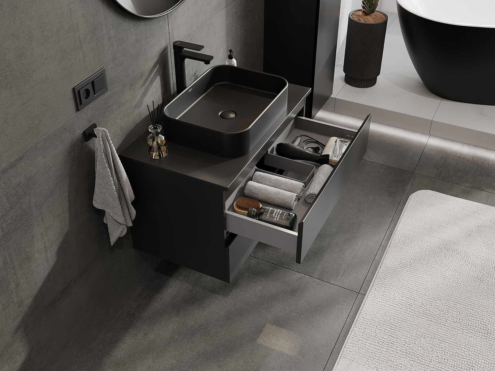 Η εγκοπή στο συρτάρι είναι σχεδιασμένη με τέτοιο τρόπο, ώστε να φιλοξενεί το σιφόνι, το οποίο είναι απαραίτητο στις εγκαταστάσεις νιπτήρων. Έτσι, το έπιπλο μπορεί να εγκατασταθεί πλήρως λειτουργικά, χωρίς την ανάγκη παραίτησης από χώρο στο συρτάρι υπέρ της εγκατάστασης.