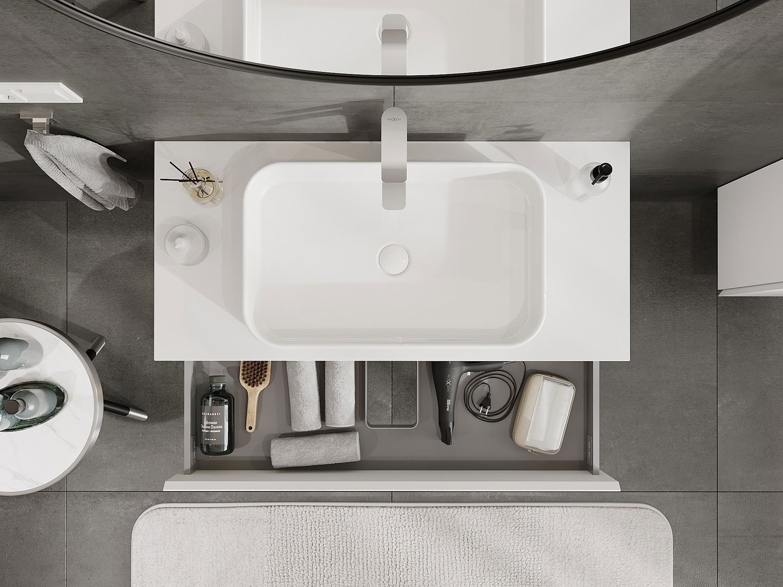 Η εγκοπή στο συρτάρι είναι σχεδιασμένη με τέτοιο τρόπο, ώστε να φιλοξενεί το σιφόνι, το οποίο είναι απαραίτητο στις εγκαταστάσεις νιπτήρων. Έτσι, το έπιπλο μπορεί να εγκατασταθεί πλήρως λειτουργικά, χωρίς την ανάγκη παραίτησης από χώρο στο συρτάρι υπέρ της εγκατάστασης.