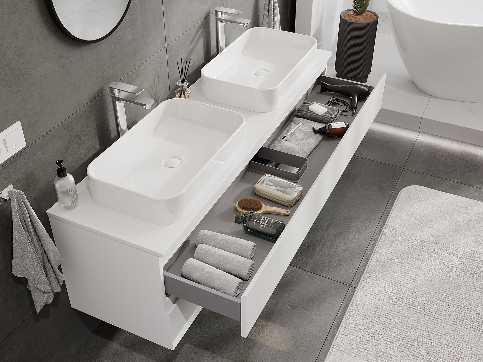 Τα αρθρωτά έπιπλα μπάνιου μας μπορούν να συνδυαστούν μεταξύ τους σε διάφορες χρωματικές διαμορφώσεις, επιτρέποντας πλήρη εξατομίκευση. Μπορείτε να επιλέξετε τόσο την εμφάνιση όσο και τις λειτουργίες των επιμέρους στοιχείων, ώστε να προσαρμόσετε τα έπιπλα στις δικές σας στιλιστικές και λειτουργικές προτιμήσεις.