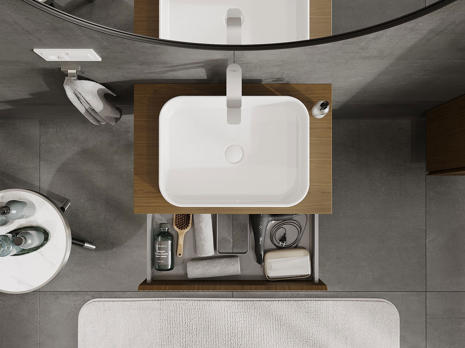 Η εγκοπή στο συρτάρι είναι σχεδιασμένη με τέτοιο τρόπο, ώστε να φιλοξενεί το σιφόνι, το οποίο είναι απαραίτητο στις εγκαταστάσεις νιπτήρων. Έτσι, το έπιπλο μπορεί να εγκατασταθεί πλήρως λειτουργικά, χωρίς την ανάγκη παραίτησης από χώρο στο συρτάρι υπέρ της εγκατάστασης.