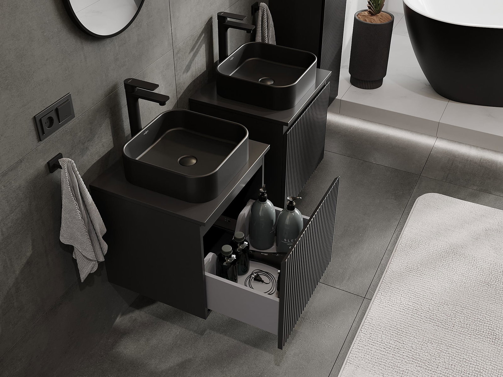 Η εγκοπή στο συρτάρι είναι σχεδιασμένη με τέτοιο τρόπο, ώστε να φιλοξενεί το σιφόνι, το οποίο είναι απαραίτητο στις εγκαταστάσεις νιπτήρων. Έτσι, το έπιπλο μπορεί να εγκατασταθεί πλήρως λειτουργικά, χωρίς την ανάγκη παραίτησης από χώρο στο συρτάρι υπέρ της εγκατάστασης.