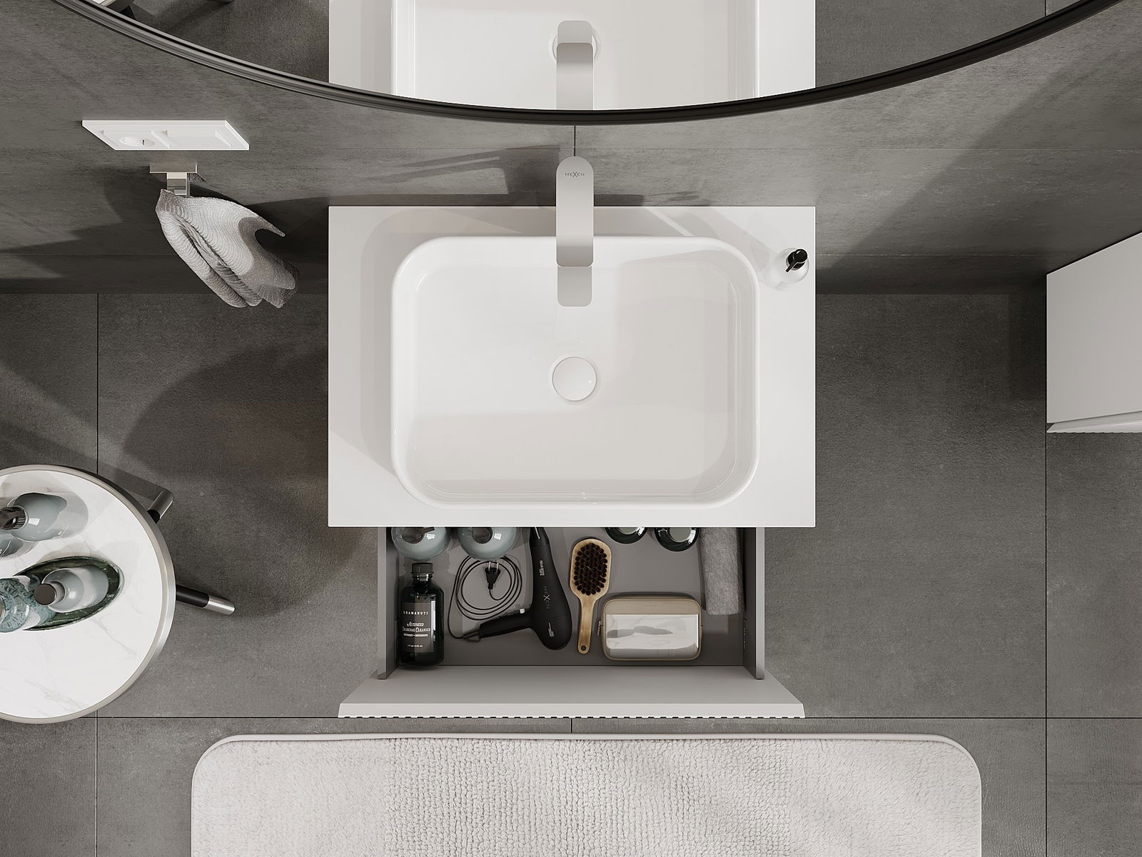 Η εγκοπή στο συρτάρι είναι σχεδιασμένη με τέτοιο τρόπο, ώστε να φιλοξενεί το σιφόνι, το οποίο είναι απαραίτητο στις εγκαταστάσεις νιπτήρων. Έτσι, το έπιπλο μπορεί να εγκατασταθεί πλήρως λειτουργικά, χωρίς την ανάγκη παραίτησης από χώρο στο συρτάρι υπέρ της εγκατάστασης.