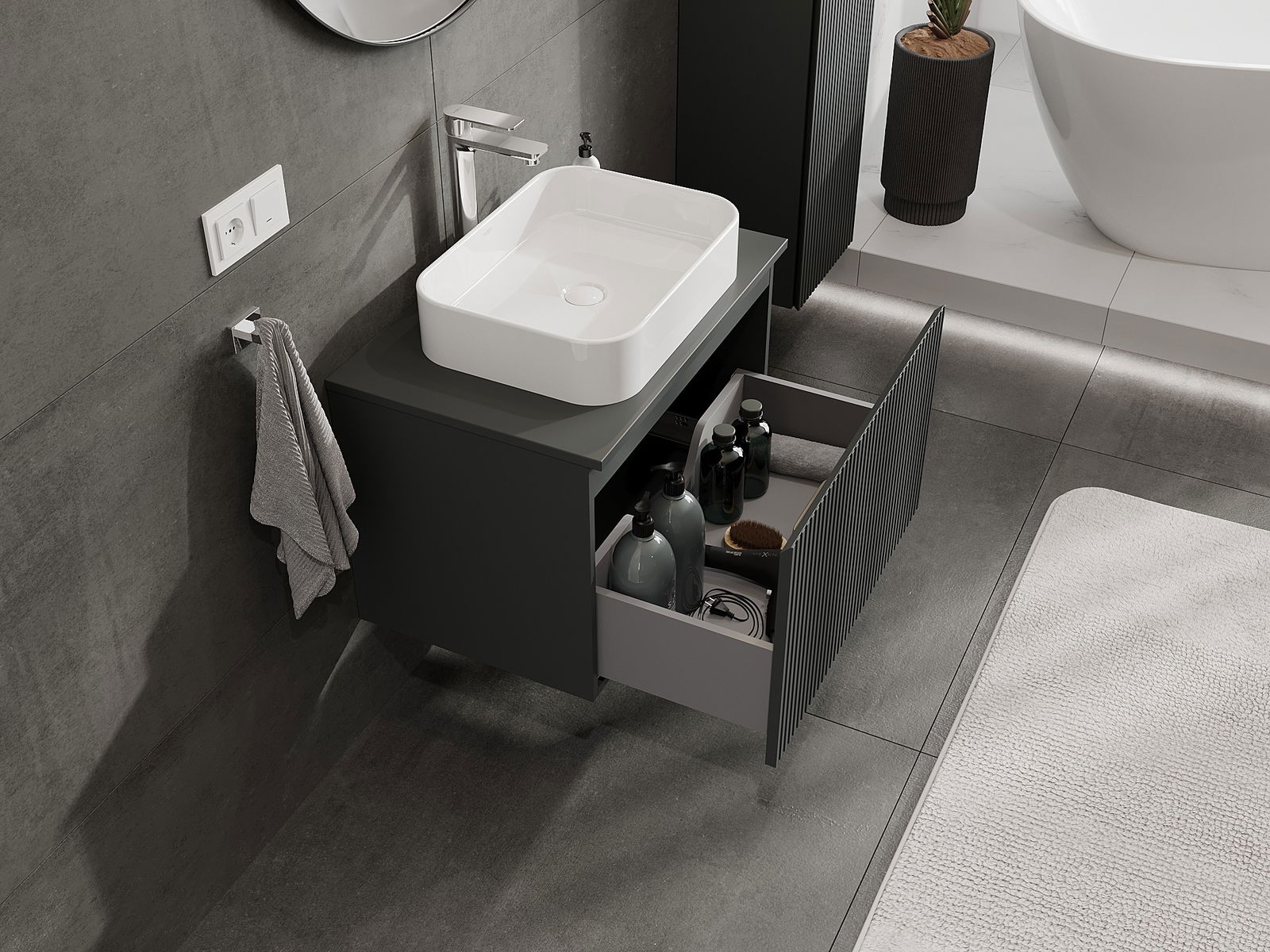 Η εγκοπή στο συρτάρι είναι σχεδιασμένη με τέτοιο τρόπο, ώστε να φιλοξενεί το σιφόνι, το οποίο είναι απαραίτητο στις εγκαταστάσεις νιπτήρων. Έτσι, το έπιπλο μπορεί να εγκατασταθεί πλήρως λειτουργικά, χωρίς την ανάγκη παραίτησης από χώρο στο συρτάρι υπέρ της εγκατάστασης.