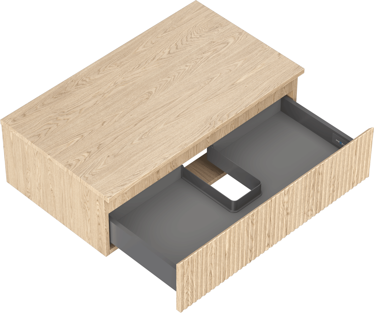 Η εγκοπή στο συρτάρι είναι σχεδιασμένη με τέτοιο τρόπο, ώστε να φιλοξενεί το σιφόνι, το οποίο είναι απαραίτητο στις εγκαταστάσεις νιπτήρων. Έτσι, το έπιπλο μπορεί να εγκατασταθεί πλήρως λειτουργικά, χωρίς την ανάγκη παραίτησης από χώρο στο συρτάρι υπέρ της εγκατάστασης.
