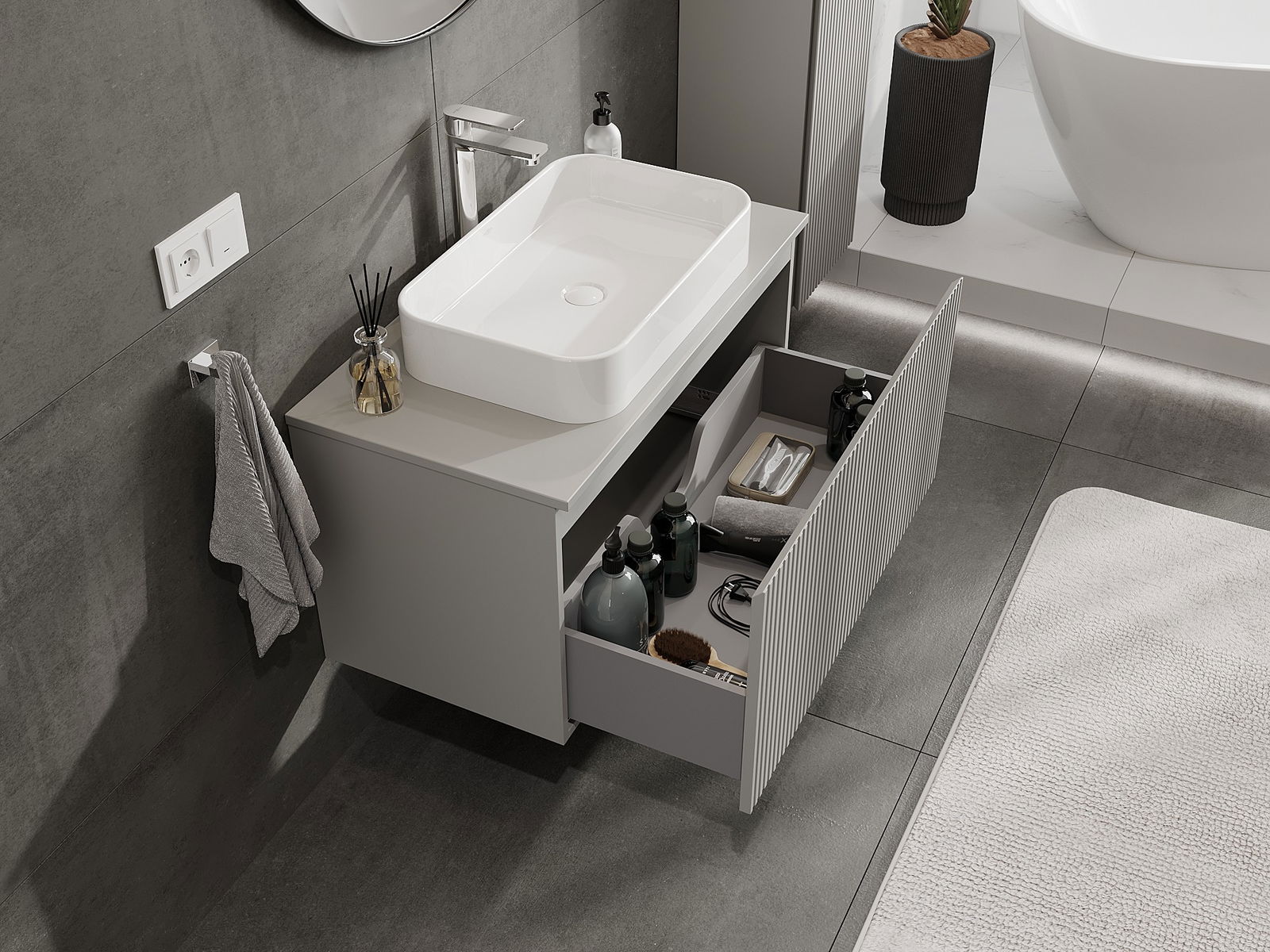 Η εγκοπή στο συρτάρι είναι σχεδιασμένη με τέτοιο τρόπο, ώστε να φιλοξενεί το σιφόνι, το οποίο είναι απαραίτητο στις εγκαταστάσεις νιπτήρων. Έτσι, το έπιπλο μπορεί να εγκατασταθεί πλήρως λειτουργικά, χωρίς την ανάγκη παραίτησης από χώρο στο συρτάρι υπέρ της εγκατάστασης.