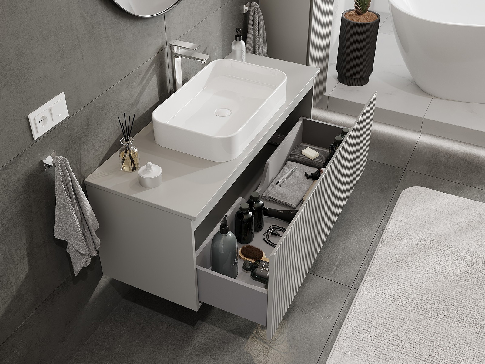 Η εγκοπή στο συρτάρι είναι σχεδιασμένη με τέτοιο τρόπο, ώστε να φιλοξενεί το σιφόνι, το οποίο είναι απαραίτητο στις εγκαταστάσεις νιπτήρων. Έτσι, το έπιπλο μπορεί να εγκατασταθεί πλήρως λειτουργικά, χωρίς την ανάγκη παραίτησης από χώρο στο συρτάρι υπέρ της εγκατάστασης.
