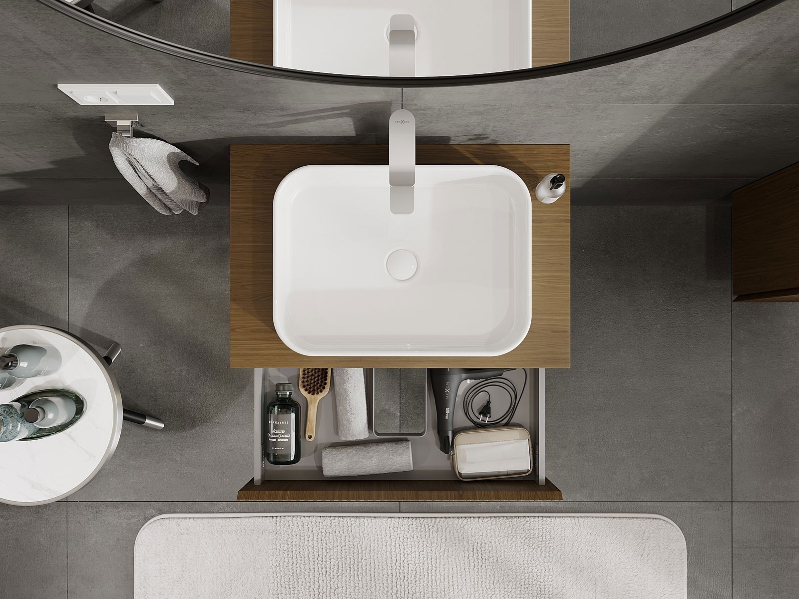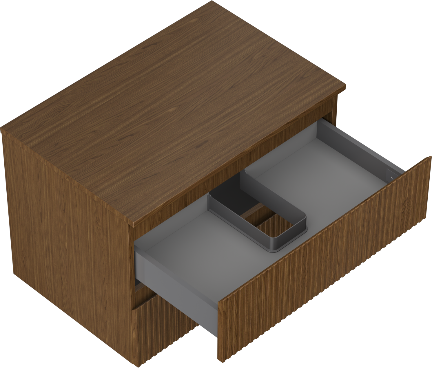 Η εγκοπή στο συρτάρι είναι σχεδιασμένη με τέτοιο τρόπο, ώστε να φιλοξενεί το σιφόνι, το οποίο είναι απαραίτητο στις εγκαταστάσεις νιπτήρων. Έτσι, το έπιπλο μπορεί να εγκατασταθεί πλήρως λειτουργικά, χωρίς την ανάγκη παραίτησης από χώρο στο συρτάρι υπέρ της εγκατάστασης.