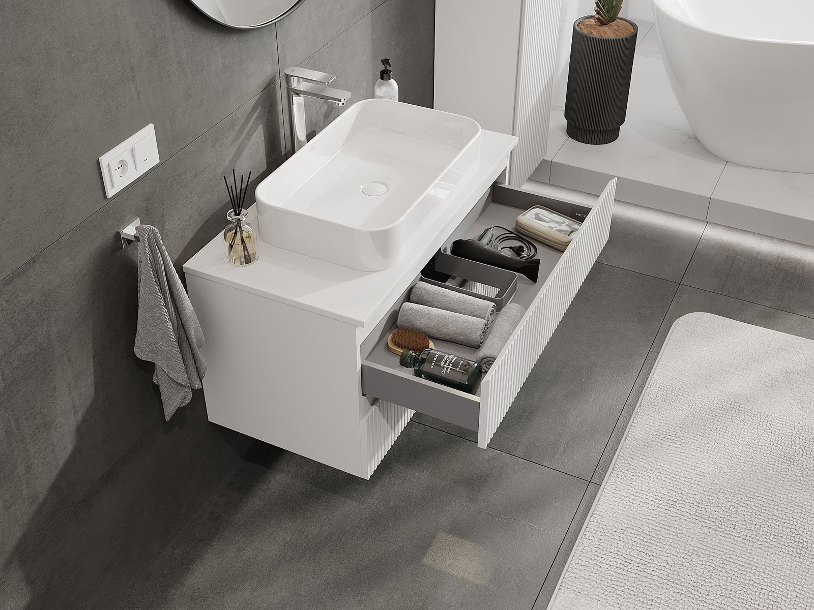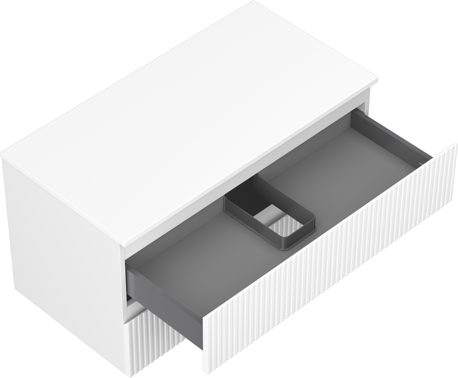 Η εγκοπή στο συρτάρι είναι σχεδιασμένη με τέτοιο τρόπο, ώστε να φιλοξενεί το σιφόνι, το οποίο είναι απαραίτητο στις εγκαταστάσεις νιπτήρων. Έτσι, το έπιπλο μπορεί να εγκατασταθεί πλήρως λειτουργικά, χωρίς την ανάγκη παραίτησης από χώρο στο συρτάρι υπέρ της εγκατάστασης.
