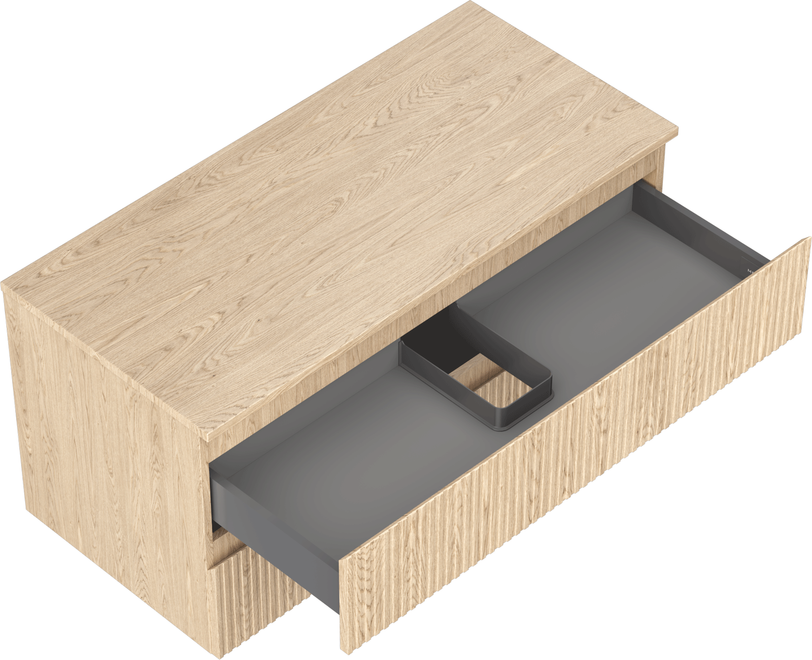 Η εγκοπή στο συρτάρι είναι σχεδιασμένη με τέτοιο τρόπο, ώστε να φιλοξενεί το σιφόνι, το οποίο είναι απαραίτητο στις εγκαταστάσεις νιπτήρων. Έτσι, το έπιπλο μπορεί να εγκατασταθεί πλήρως λειτουργικά, χωρίς την ανάγκη παραίτησης από χώρο στο συρτάρι υπέρ της εγκατάστασης.
