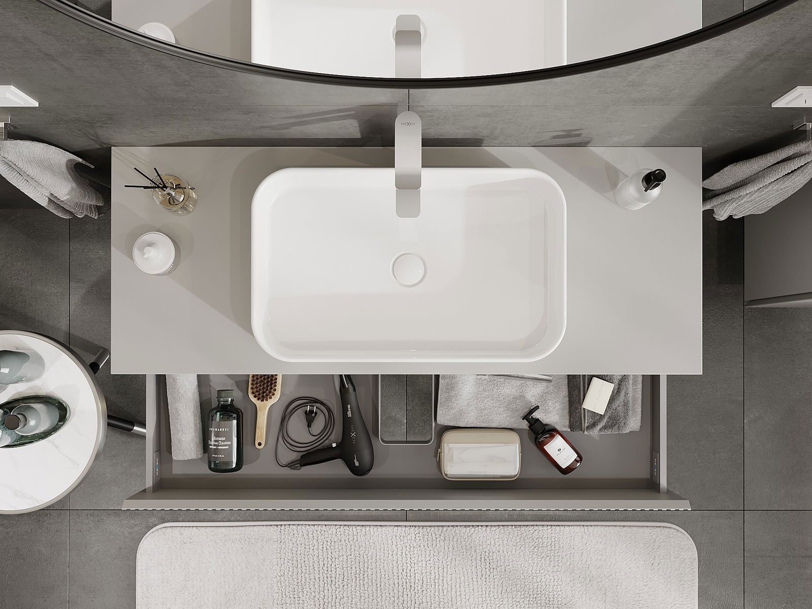 Η εγκοπή στο συρτάρι είναι σχεδιασμένη με τέτοιο τρόπο, ώστε να φιλοξενεί το σιφόνι, το οποίο είναι απαραίτητο στις εγκαταστάσεις νιπτήρων. Έτσι, το έπιπλο μπορεί να εγκατασταθεί πλήρως λειτουργικά, χωρίς την ανάγκη παραίτησης από χώρο στο συρτάρι υπέρ της εγκατάστασης.