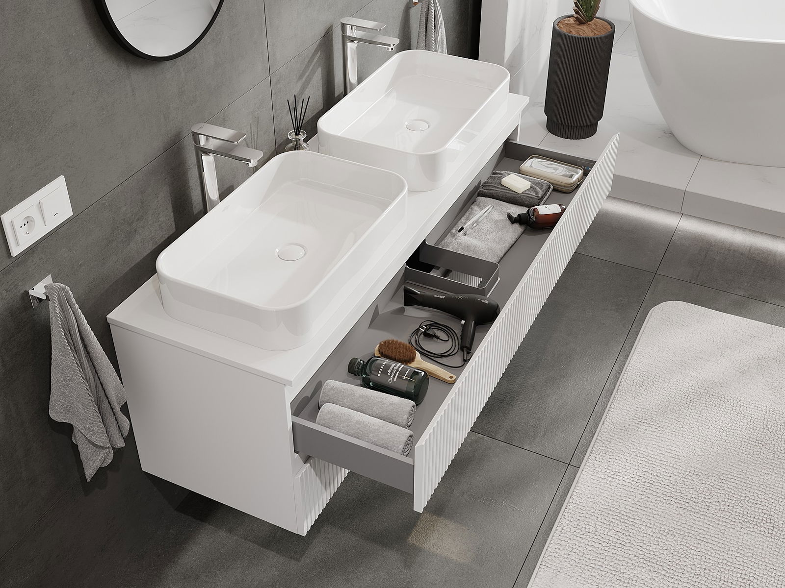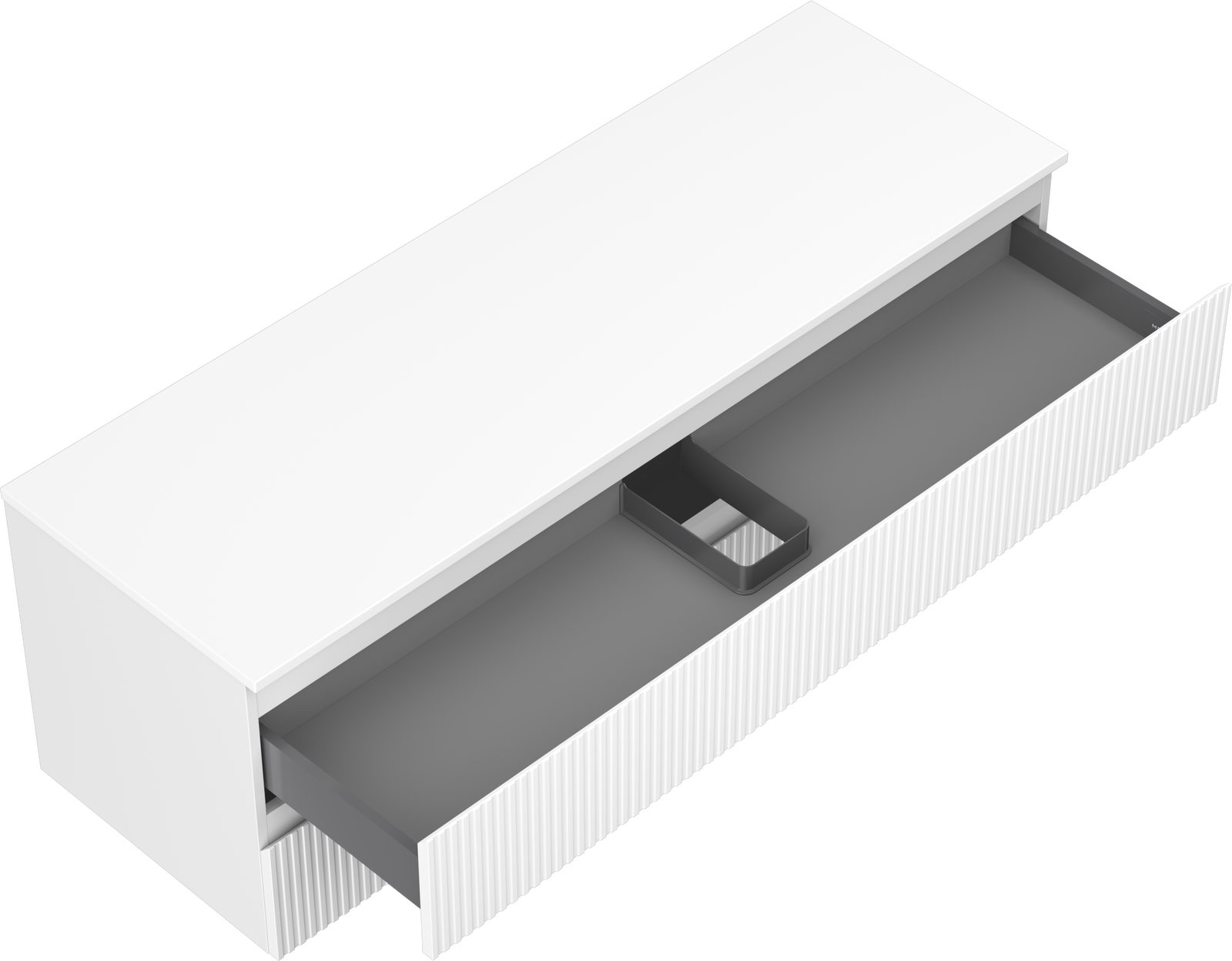 Η εγκοπή στο συρτάρι είναι σχεδιασμένη με τέτοιο τρόπο, ώστε να φιλοξενεί το σιφόνι, το οποίο είναι απαραίτητο στις εγκαταστάσεις νιπτήρων. Έτσι, το έπιπλο μπορεί να εγκατασταθεί πλήρως λειτουργικά, χωρίς την ανάγκη παραίτησης από χώρο στο συρτάρι υπέρ της εγκατάστασης.