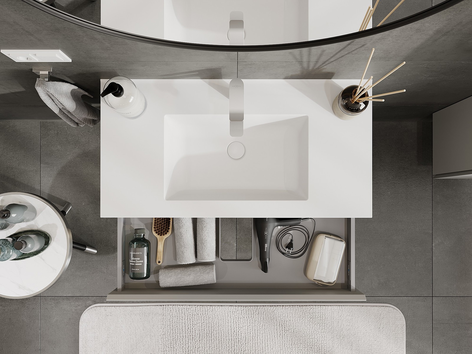 Η εγκοπή στο συρτάρι είναι σχεδιασμένη με τέτοιο τρόπο, ώστε να φιλοξενεί το σιφόνι, το οποίο είναι απαραίτητο στις εγκαταστάσεις νιπτήρων. Έτσι, το έπιπλο μπορεί να εγκατασταθεί πλήρως λειτουργικά, χωρίς την ανάγκη παραίτησης από χώρο στο συρτάρι υπέρ της εγκατάστασης.