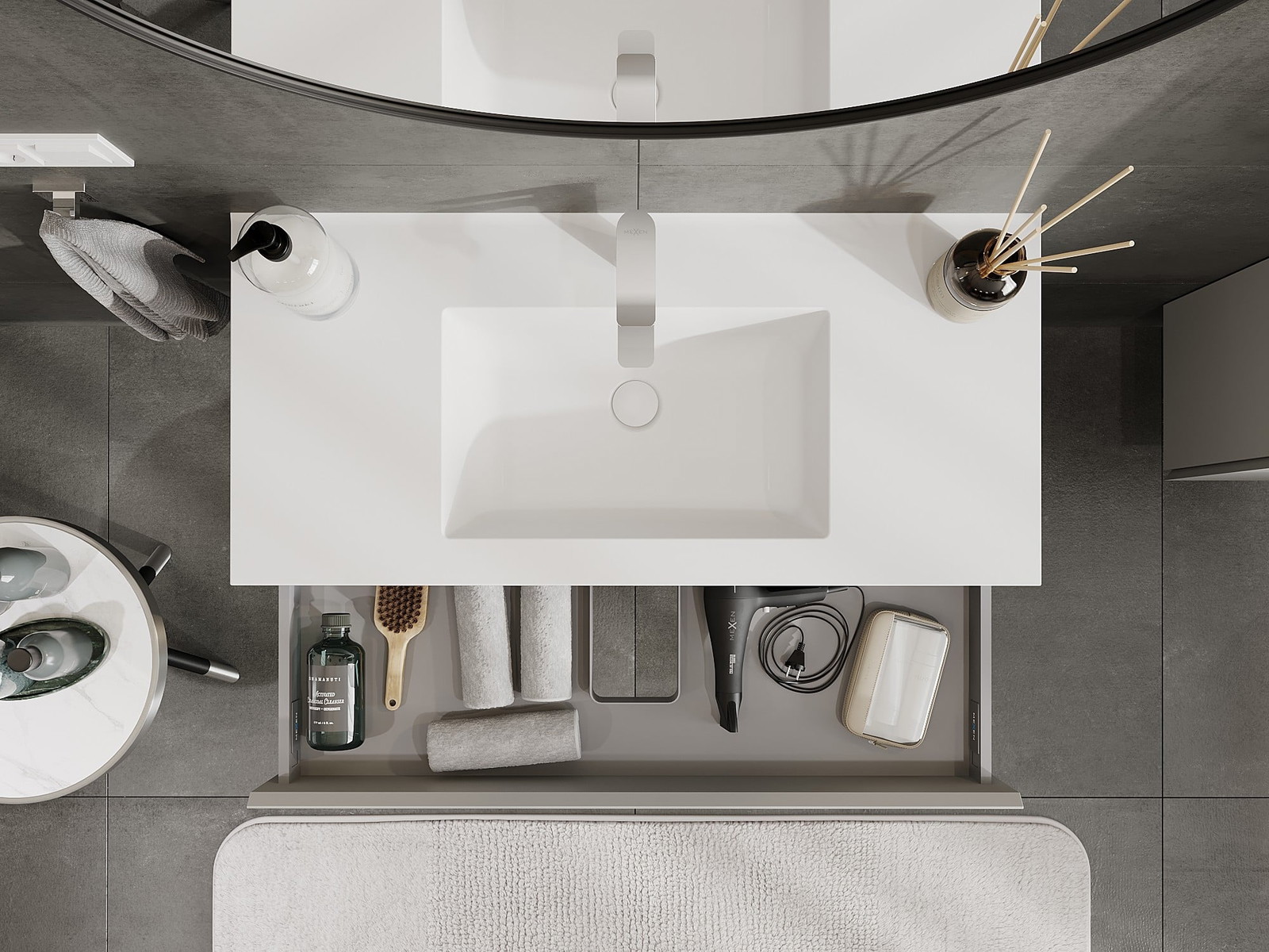 Η εγκοπή στο συρτάρι είναι σχεδιασμένη με τέτοιο τρόπο, ώστε να φιλοξενεί το σιφόνι, το οποίο είναι απαραίτητο στις εγκαταστάσεις νιπτήρων. Έτσι, το έπιπλο μπορεί να εγκατασταθεί πλήρως λειτουργικά, χωρίς την ανάγκη παραίτησης από χώρο στο συρτάρι υπέρ της εγκατάστασης.