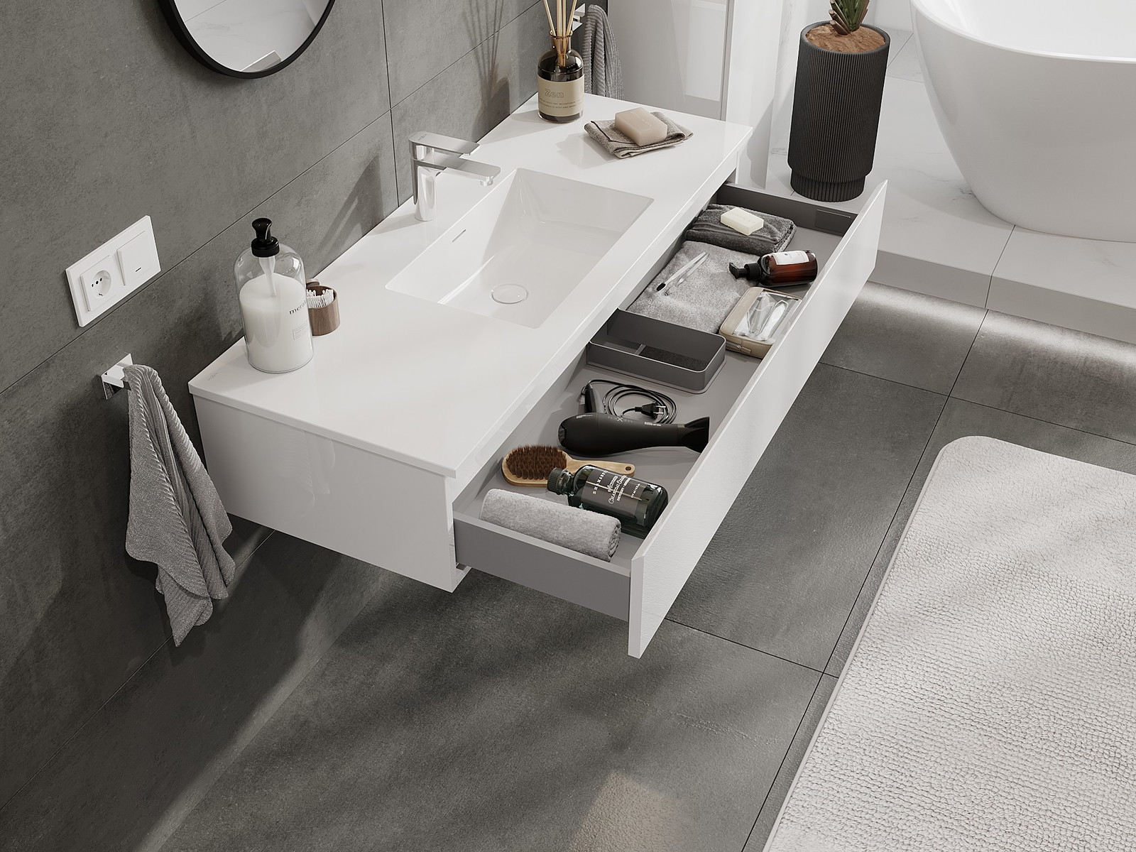 Η εγκοπή στο συρτάρι είναι σχεδιασμένη με τέτοιο τρόπο, ώστε να φιλοξενεί το σιφόνι, το οποίο είναι απαραίτητο στις εγκαταστάσεις νιπτήρων. Έτσι, το έπιπλο μπορεί να εγκατασταθεί πλήρως λειτουργικά, χωρίς την ανάγκη παραίτησης από χώρο στο συρτάρι υπέρ της εγκατάστασης.