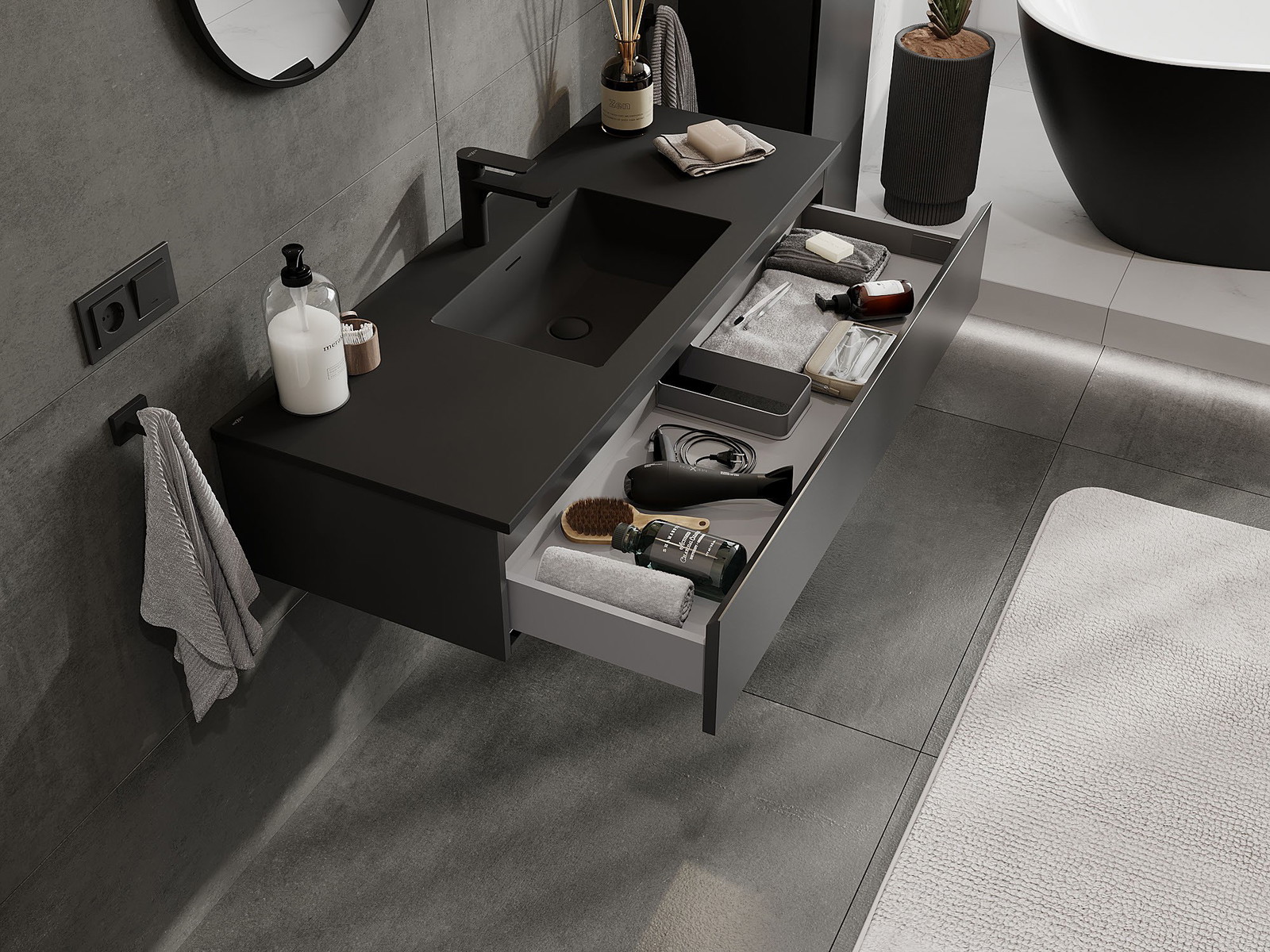 Η εγκοπή στο συρτάρι είναι σχεδιασμένη με τέτοιο τρόπο, ώστε να φιλοξενεί το σιφόνι, το οποίο είναι απαραίτητο στις εγκαταστάσεις νιπτήρων. Έτσι, το έπιπλο μπορεί να εγκατασταθεί πλήρως λειτουργικά, χωρίς την ανάγκη παραίτησης από χώρο στο συρτάρι υπέρ της εγκατάστασης.