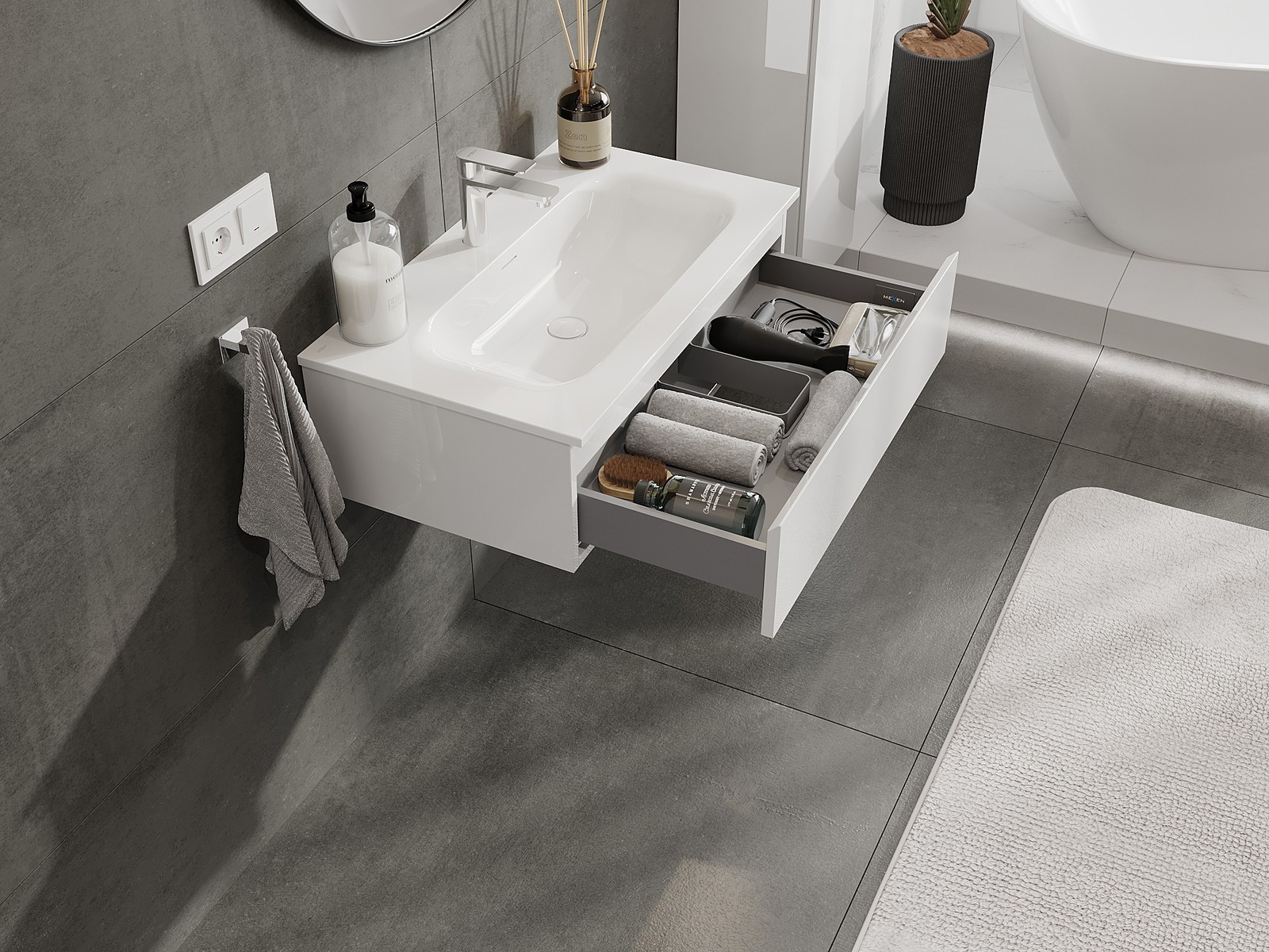 Η εγκοπή στο συρτάρι είναι σχεδιασμένη με τέτοιο τρόπο, ώστε να φιλοξενεί το σιφόνι, το οποίο είναι απαραίτητο στις εγκαταστάσεις νιπτήρων. Έτσι, το έπιπλο μπορεί να εγκατασταθεί πλήρως λειτουργικά, χωρίς την ανάγκη παραίτησης από χώρο στο συρτάρι υπέρ της εγκατάστασης.