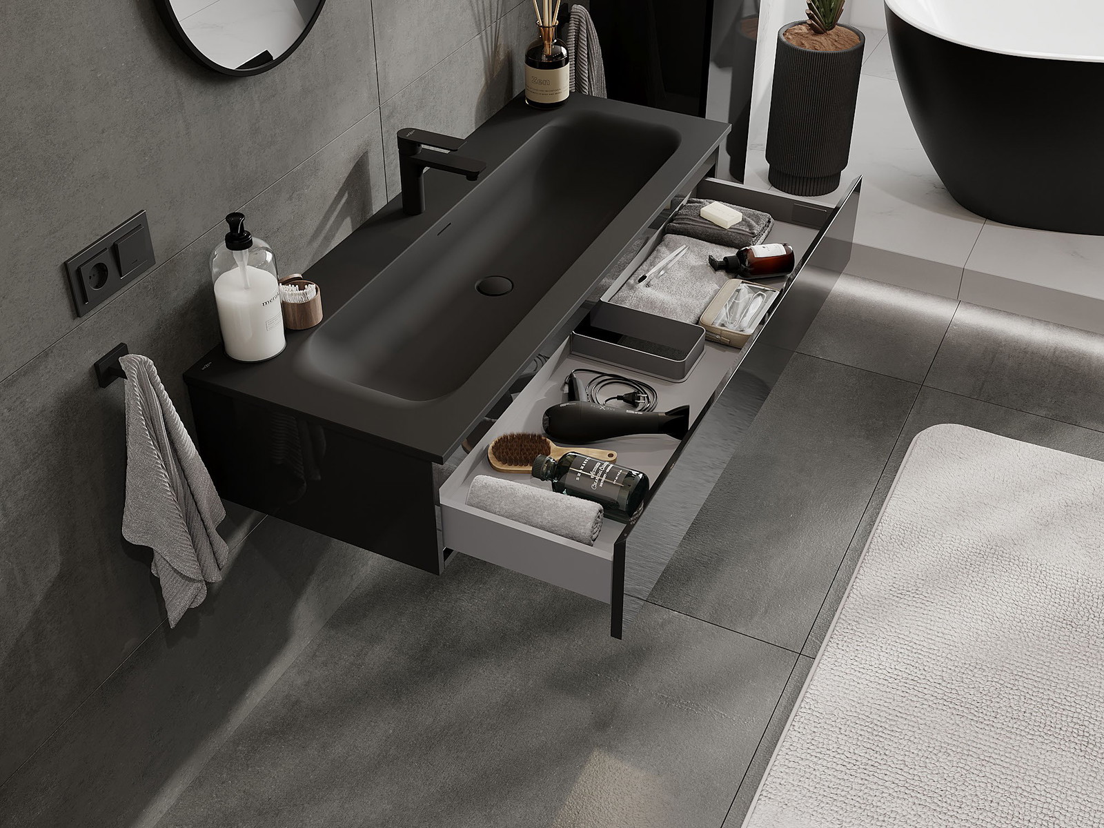 Η εγκοπή στο συρτάρι είναι σχεδιασμένη με τέτοιο τρόπο, ώστε να φιλοξενεί το σιφόνι, το οποίο είναι απαραίτητο στις εγκαταστάσεις νιπτήρων. Έτσι, το έπιπλο μπορεί να εγκατασταθεί πλήρως λειτουργικά, χωρίς την ανάγκη παραίτησης από χώρο στο συρτάρι υπέρ της εγκατάστασης.
