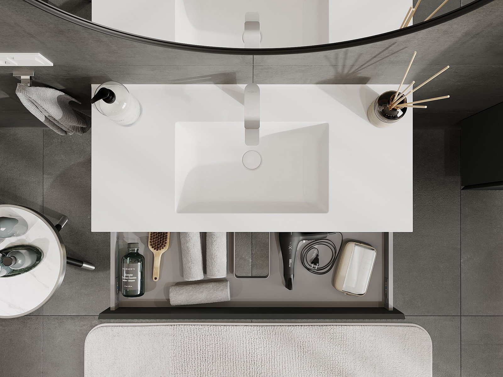 Η εγκοπή στο συρτάρι είναι σχεδιασμένη με τέτοιο τρόπο, ώστε να φιλοξενεί το σιφόνι, το οποίο είναι απαραίτητο στις εγκαταστάσεις νιπτήρων. Έτσι, το έπιπλο μπορεί να εγκατασταθεί πλήρως λειτουργικά, χωρίς την ανάγκη παραίτησης από χώρο στο συρτάρι υπέρ της εγκατάστασης.