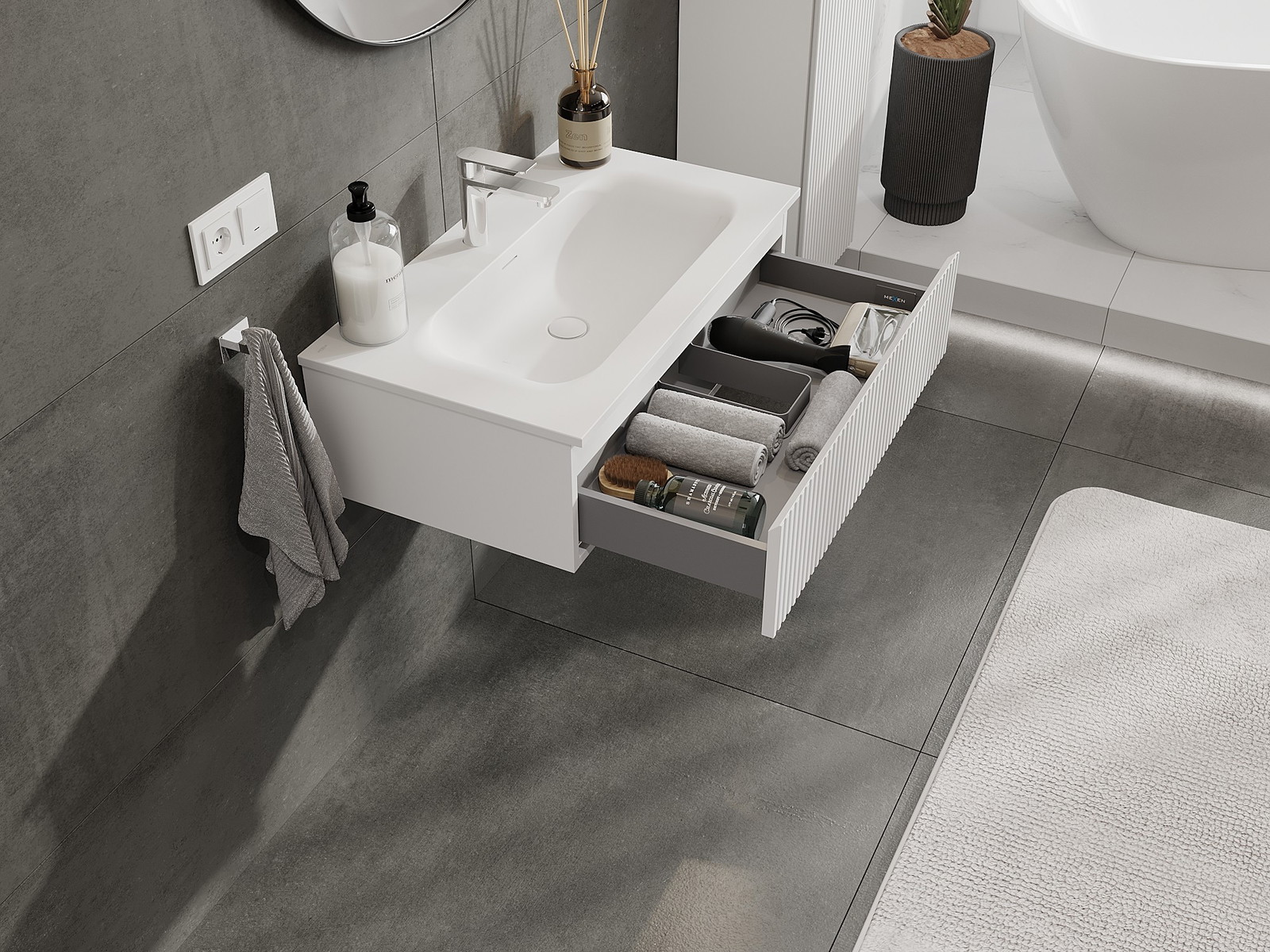 Η εγκοπή στο συρτάρι είναι σχεδιασμένη με τέτοιο τρόπο, ώστε να φιλοξενεί το σιφόνι, το οποίο είναι απαραίτητο στις εγκαταστάσεις νιπτήρων. Έτσι, το έπιπλο μπορεί να εγκατασταθεί πλήρως λειτουργικά, χωρίς την ανάγκη παραίτησης από χώρο στο συρτάρι υπέρ της εγκατάστασης.