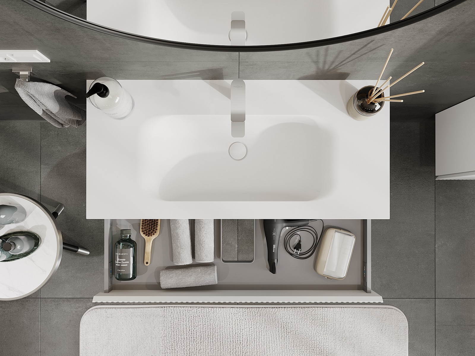 Η εγκοπή στο συρτάρι είναι σχεδιασμένη με τέτοιο τρόπο, ώστε να φιλοξενεί το σιφόνι, το οποίο είναι απαραίτητο στις εγκαταστάσεις νιπτήρων. Έτσι, το έπιπλο μπορεί να εγκατασταθεί πλήρως λειτουργικά, χωρίς την ανάγκη παραίτησης από χώρο στο συρτάρι υπέρ της εγκατάστασης.