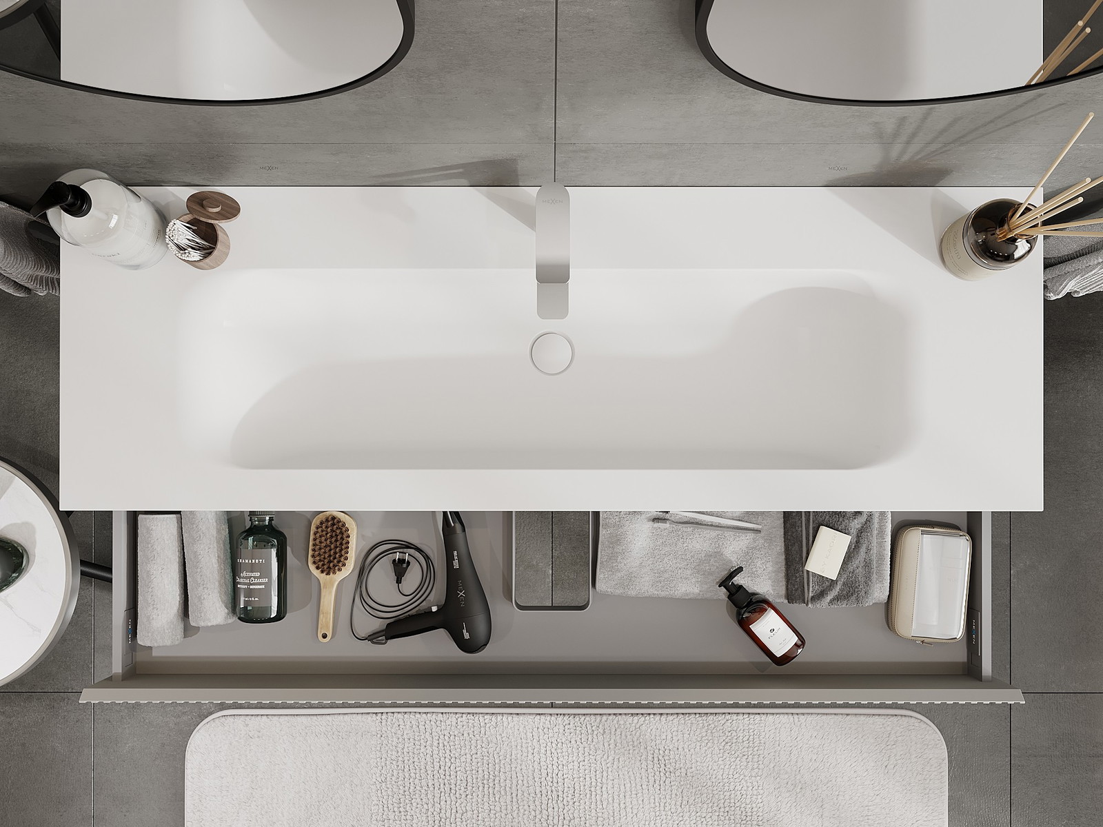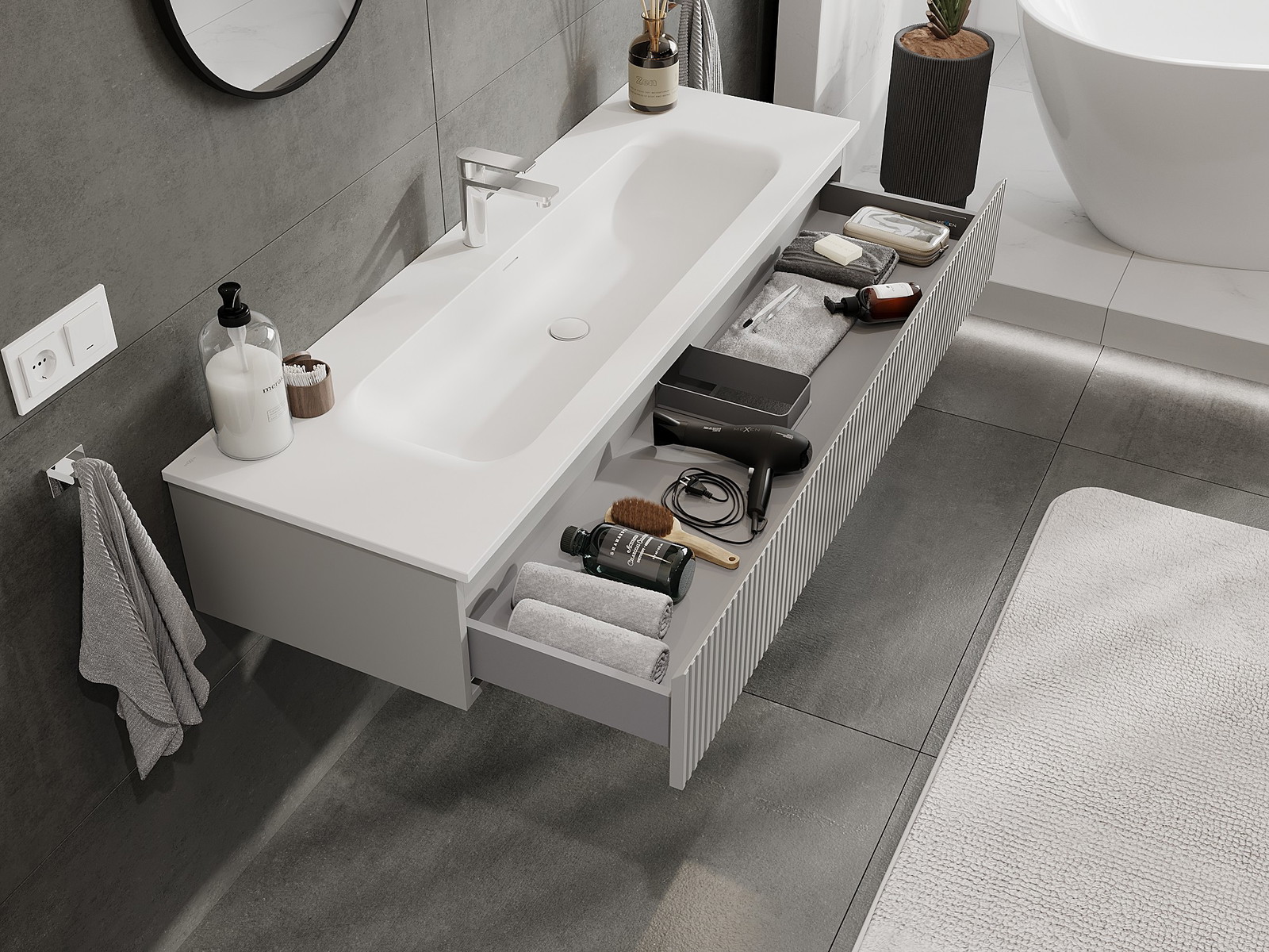 Η εγκοπή στο συρτάρι είναι σχεδιασμένη με τέτοιο τρόπο, ώστε να φιλοξενεί το σιφόνι, το οποίο είναι απαραίτητο στις εγκαταστάσεις νιπτήρων. Έτσι, το έπιπλο μπορεί να εγκατασταθεί πλήρως λειτουργικά, χωρίς την ανάγκη παραίτησης από χώρο στο συρτάρι υπέρ της εγκατάστασης.