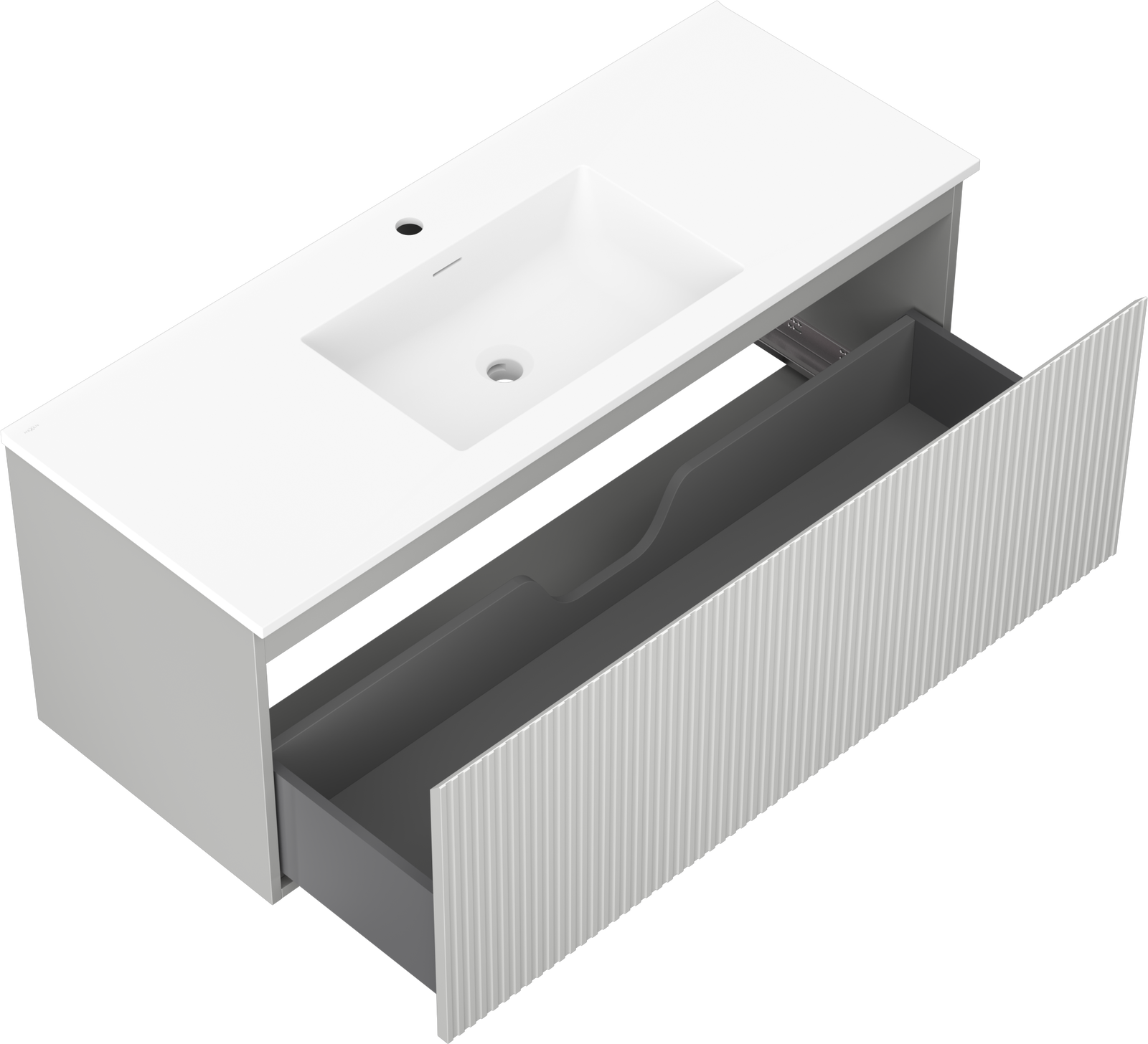 Η εγκοπή στο συρτάρι είναι σχεδιασμένη με τέτοιο τρόπο, ώστε να φιλοξενεί το σιφόνι, το οποίο είναι απαραίτητο στις εγκαταστάσεις νιπτήρων. Έτσι, το έπιπλο μπορεί να εγκατασταθεί πλήρως λειτουργικά, χωρίς την ανάγκη παραίτησης από χώρο στο συρτάρι υπέρ της εγκατάστασης.