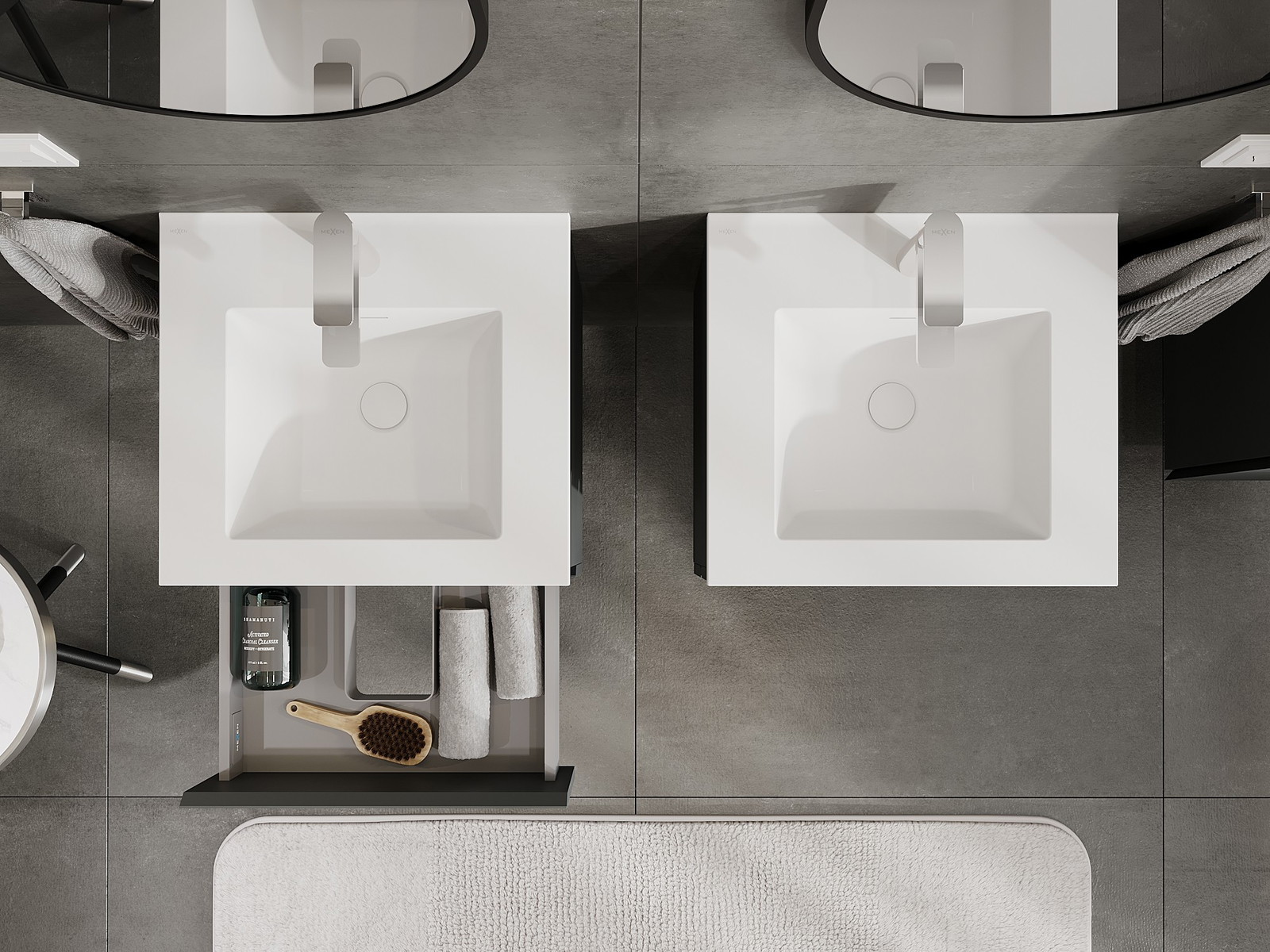 Η εγκοπή στο συρτάρι είναι σχεδιασμένη με τέτοιο τρόπο, ώστε να φιλοξενεί το σιφόνι, το οποίο είναι απαραίτητο στις εγκαταστάσεις νιπτήρων. Έτσι, το έπιπλο μπορεί να εγκατασταθεί πλήρως λειτουργικά, χωρίς την ανάγκη παραίτησης από χώρο στο συρτάρι υπέρ της εγκατάστασης.