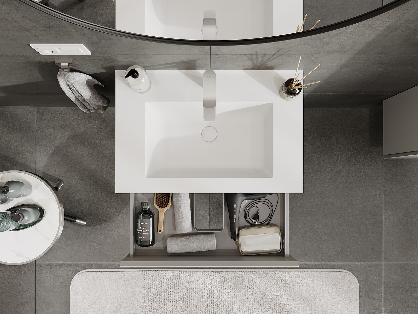 Η εγκοπή στο συρτάρι είναι σχεδιασμένη με τέτοιο τρόπο, ώστε να φιλοξενεί το σιφόνι, το οποίο είναι απαραίτητο στις εγκαταστάσεις νιπτήρων. Έτσι, το έπιπλο μπορεί να εγκατασταθεί πλήρως λειτουργικά, χωρίς την ανάγκη παραίτησης από χώρο στο συρτάρι υπέρ της εγκατάστασης.