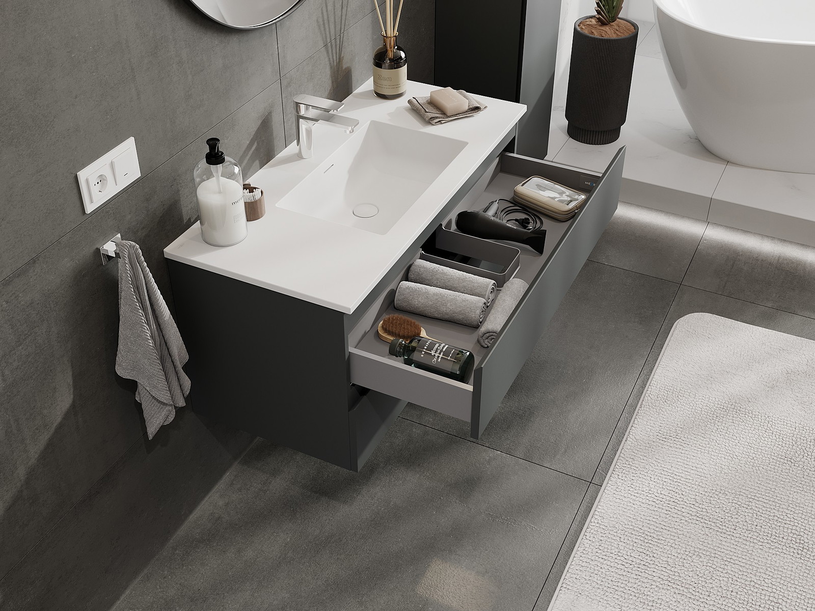 Η εγκοπή στο συρτάρι είναι σχεδιασμένη με τέτοιο τρόπο, ώστε να φιλοξενεί το σιφόνι, το οποίο είναι απαραίτητο στις εγκαταστάσεις νιπτήρων. Έτσι, το έπιπλο μπορεί να εγκατασταθεί πλήρως λειτουργικά, χωρίς την ανάγκη παραίτησης από χώρο στο συρτάρι υπέρ της εγκατάστασης.
