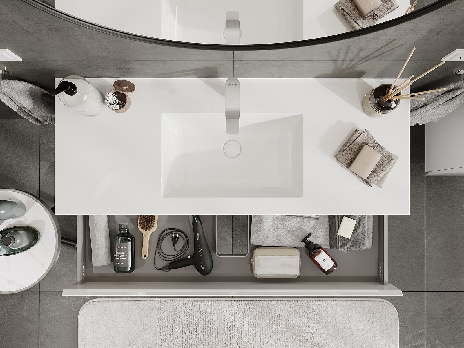 Η εγκοπή στο συρτάρι είναι σχεδιασμένη με τέτοιο τρόπο, ώστε να φιλοξενεί το σιφόνι, το οποίο είναι απαραίτητο στις εγκαταστάσεις νιπτήρων. Έτσι, το έπιπλο μπορεί να εγκατασταθεί πλήρως λειτουργικά, χωρίς την ανάγκη παραίτησης από χώρο στο συρτάρι υπέρ της εγκατάστασης.